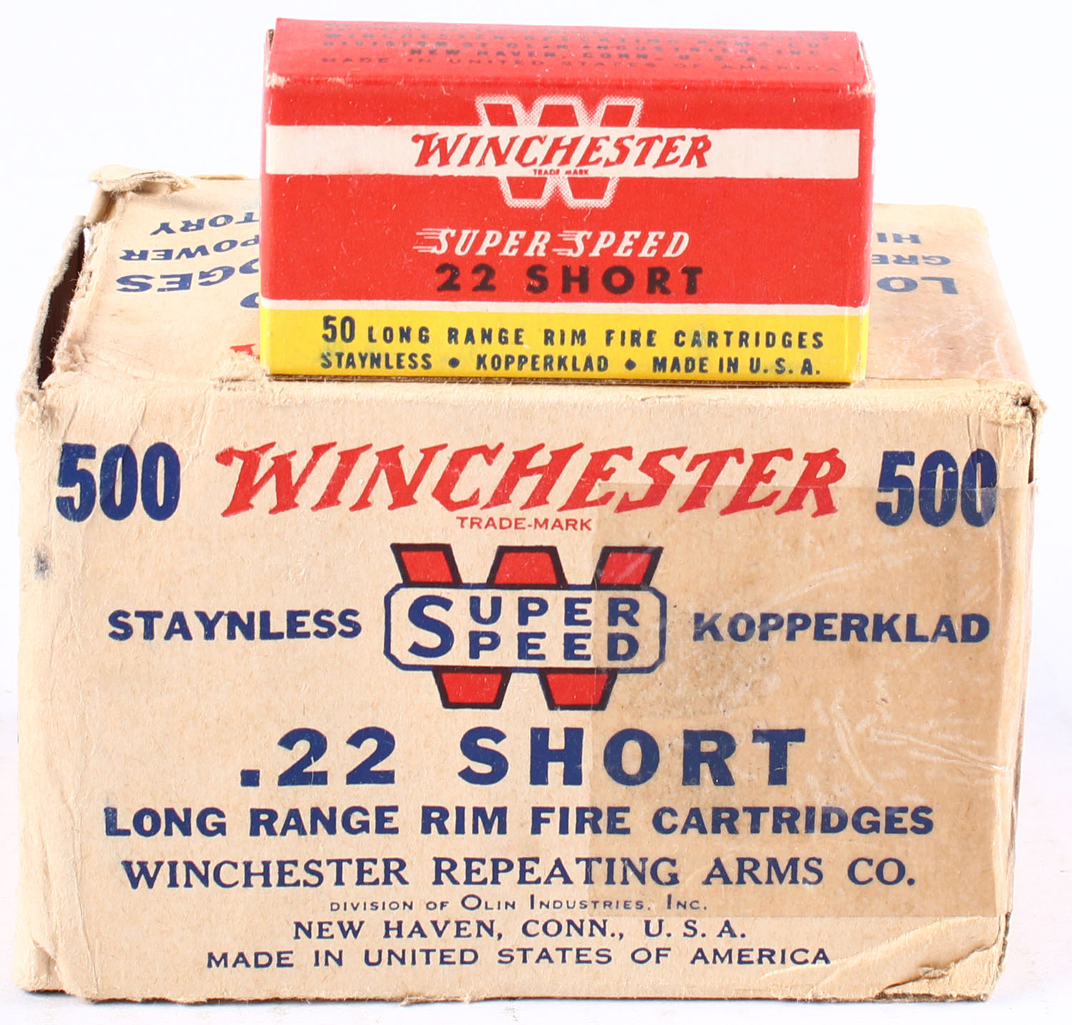 Winchester, Super Speed, .22 Short, Staynless Kopperklad, Full, 500rds. 1pc. Buff brick, box has several seam splits, right end flap is taped, left end flap is torn, excellent color, edge & corner wear, inside boxes are excellent to minty. Grade: Good - Value: 100 to 200