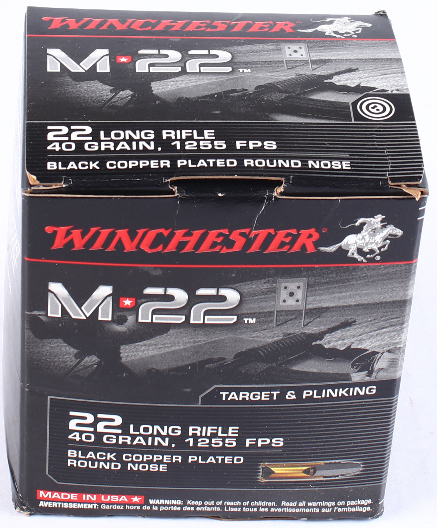 Winchester, M22, .22 Long Rifle, 40 Grain Black Copper Plated Round Nose, Full, 500rds., 1pc. Black & red brick, brick is solid with minty color, has edge & corner wear, top flap is solid, ammo is excellent. Grade: Excellent - Value: 40 to 100