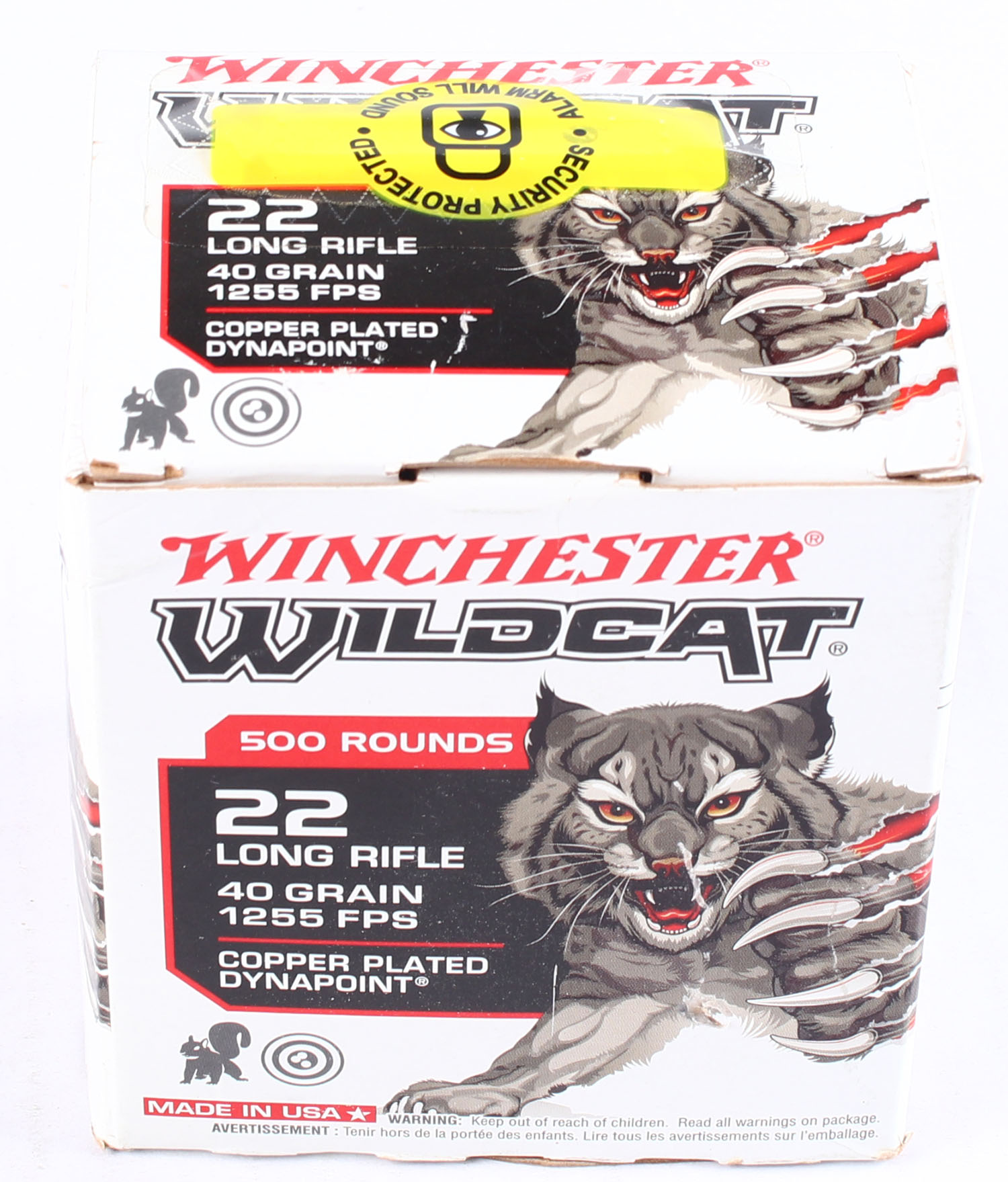 Winchester, Wildcat, .22 Long Rifle, 40 grain, Copper Plated Dynapoint, Full, 500rds., 1pc., White red & black box, box is solid with excellent color, has corner & shelf wear, top flap is solid, ammo is excellent. Grade: Very Good ++ - Value: 30 to 90
