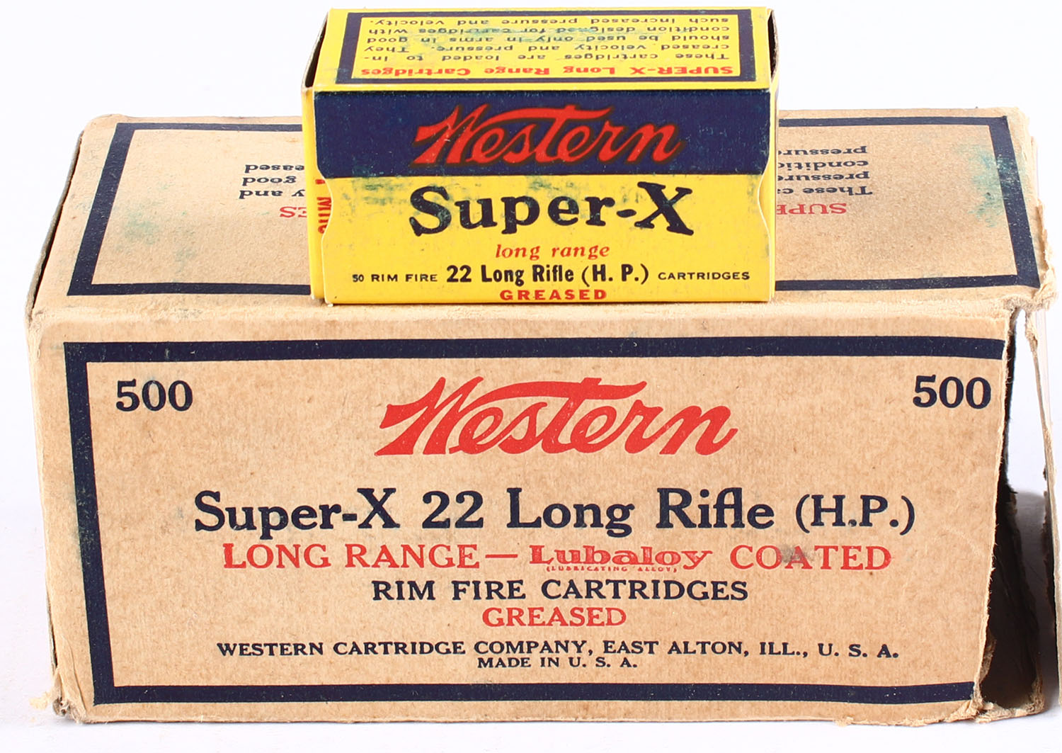 Western, Super-X, .22 Long Rifle, Hollow Point Lubaloy, Partial 400rds., 1pc. Buff brick, brick has torn right end flap, age soiling, some shelf wear, corner wear, some edge wear, left flap is solid, inside boxes are excellent. Grade: Very Good - Value: 80 to 140