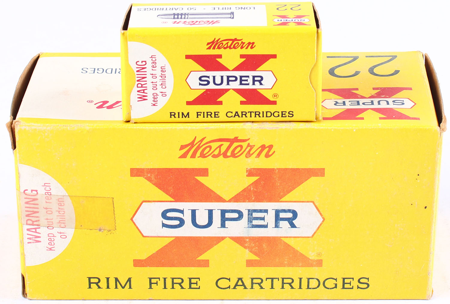 Western, Super-X, .22 Long Rifle, 40 Grain Lubaloy Coated Bullet, Full, 500rds., 1pc. Yellow white & red brick, brick is solid with very good color, some shelf wear & color fading, minor edge & corner wear, end flaps are solid, inside boxes are mint. Grade: Excellent - Value: 40 to 100