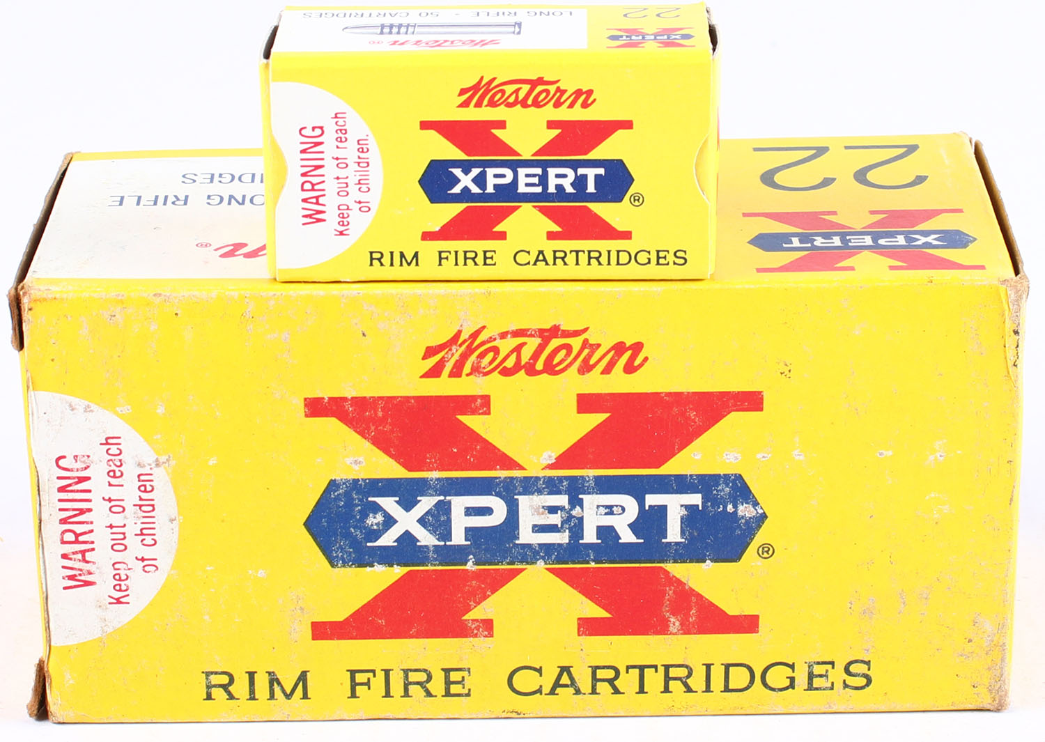 Western, Xpert, .22 Long Rifle, 40 Grain Lead, Full, 500rds., 1pc. Yellow white & red brick, brick has scuffing with some age soiling, edge & corner wear, end flaps are solid, inside boxes are excellent to minty. Grade: Very Good ++ - Value: 30 to 90