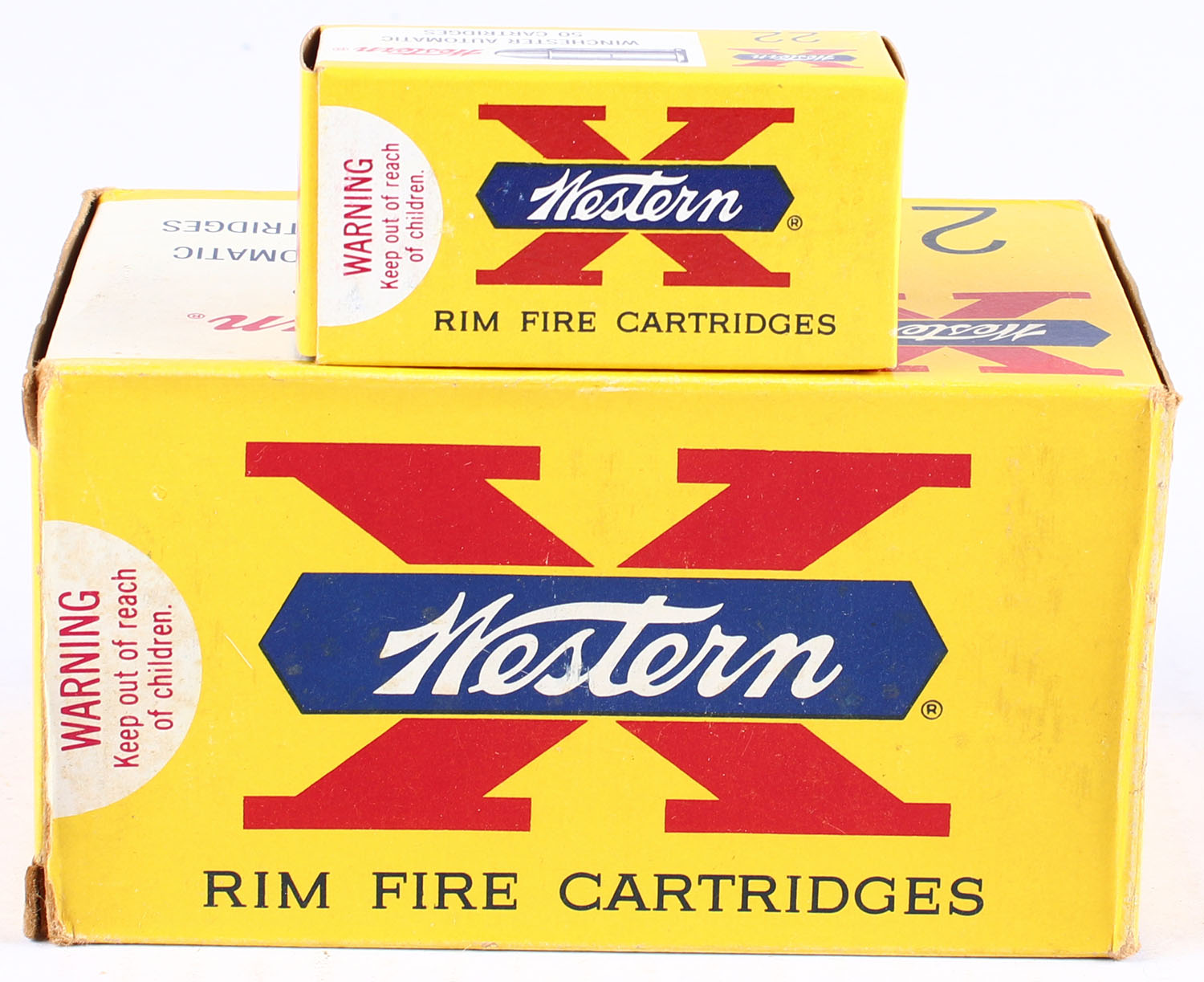 Western, X, .22 Winchester Auto., 45 Grain Lubaloy Bullet, Full, 500rds. 1pc., Yellow blue & red brick, brick is solid with excellent color, brick has very minor shelf wear, corner wear, end flaps are solid, inside boxes are minty. Grade: Excellent - Value: 50 to 150