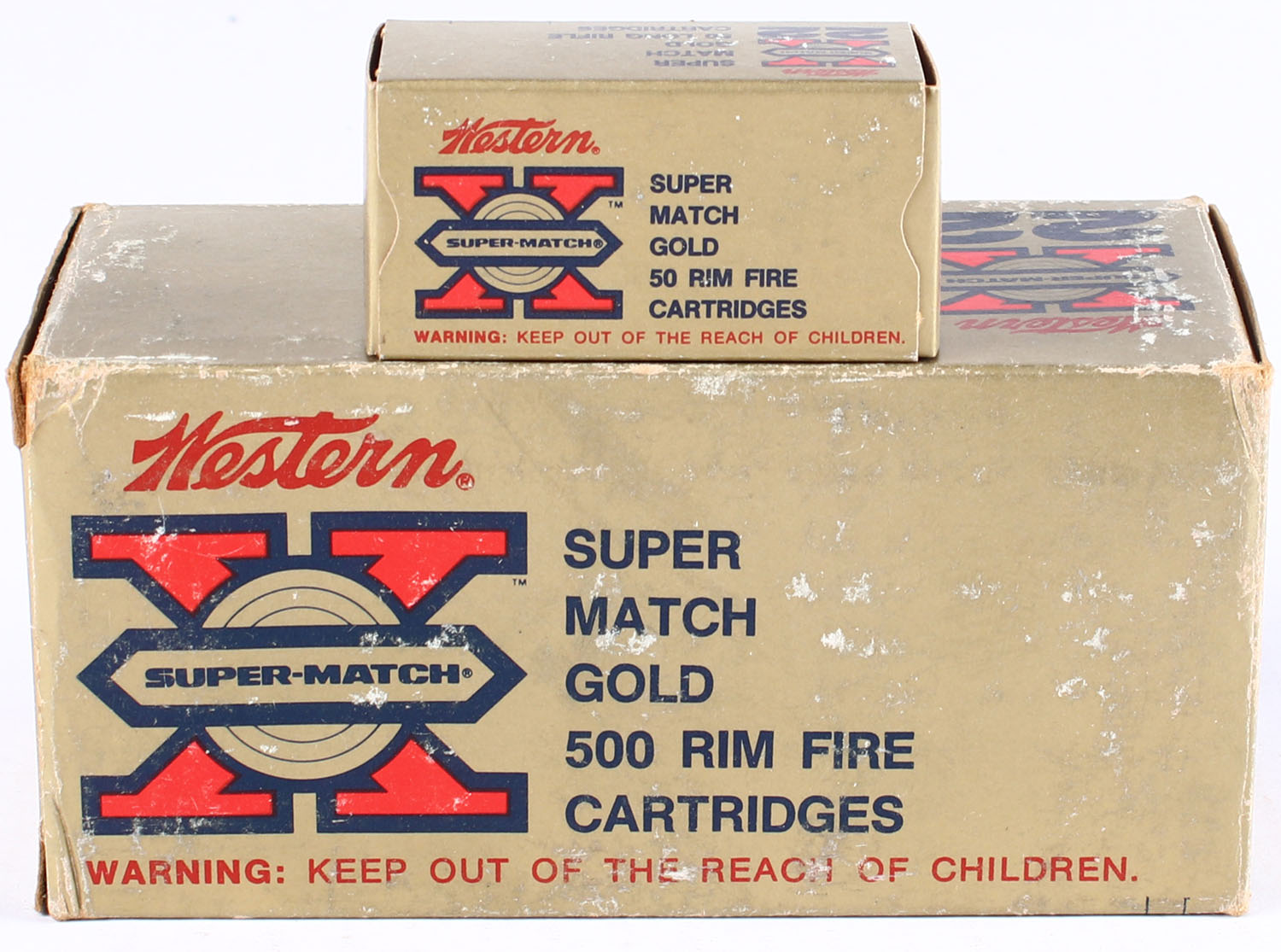 Western, Super-Match Gold, .22 Long Rifle, Special Match Bullet, Full, 500rds. 1pc., Gold red & black brick, brick has age soiling & scuffing, has edge & corner wear, end flaps are solid, inside boxes are excellent. Grade: Very Good - Value: 50 to 150