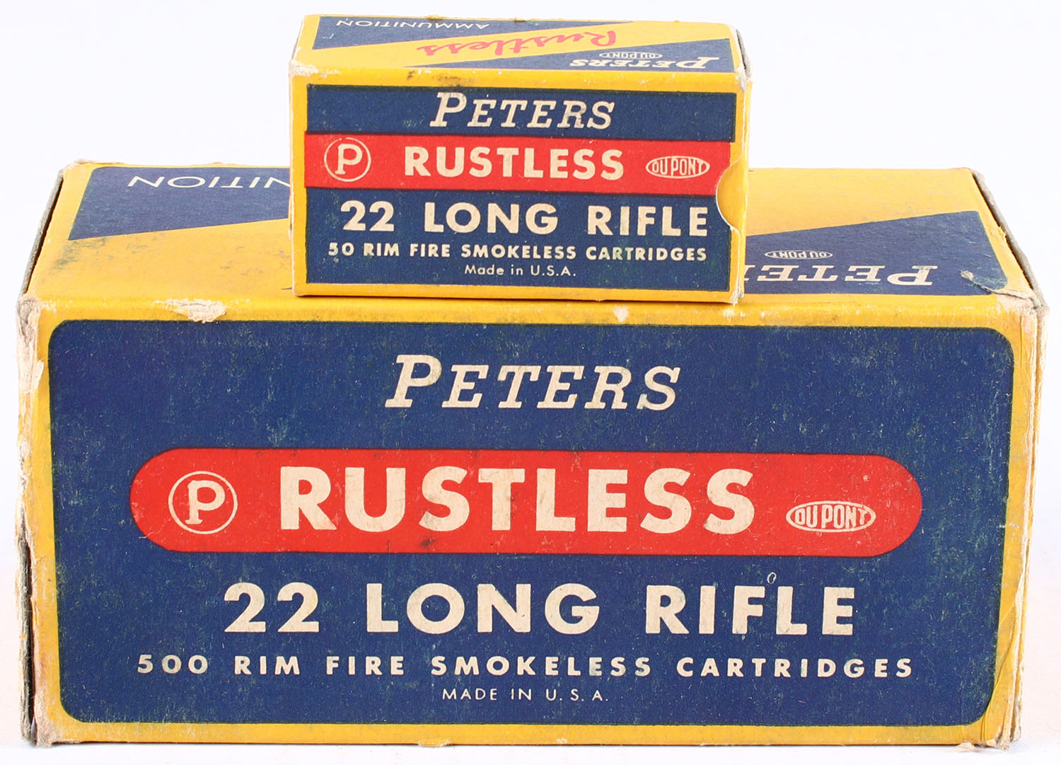 Peters, Rustless, .22 Long Rifle, Full 500rds., 1pc., Yellow blue & red brick, brick is solid with great color, has some age soiling with scuffing, edge & corner wear, end flaps are solid, inside boxes are excellent. Grade: Very Good ++ - Value: 50 to 150