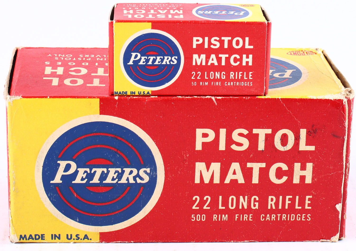 Peters, Pistol Match, .22 Long Rifle, Full, 500rds., 1pc., Red yellow & blue brick, brick is solid with excellent color, has edge & corner wear, light age soiling, end flaps are solid, inside boxes are excellent. Grade: Very Good - Value: 40 to 120