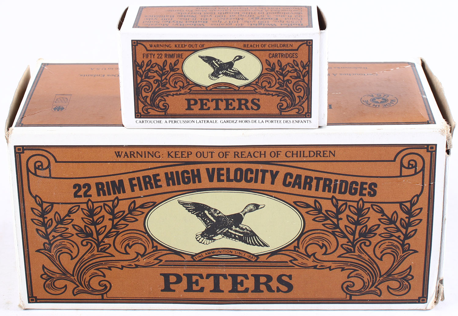 Peters, Rim Fire High Velocity Cartridges, .22 Long Rifle, High Velocity, Solid Point, Partial 300rds., brown & green brick, brick is solid with great color, very minor shelf & corner wear, edges are crisp, end flaps are solid, inside boxes are mint. Grade: Excellent - Value: 30 to 60