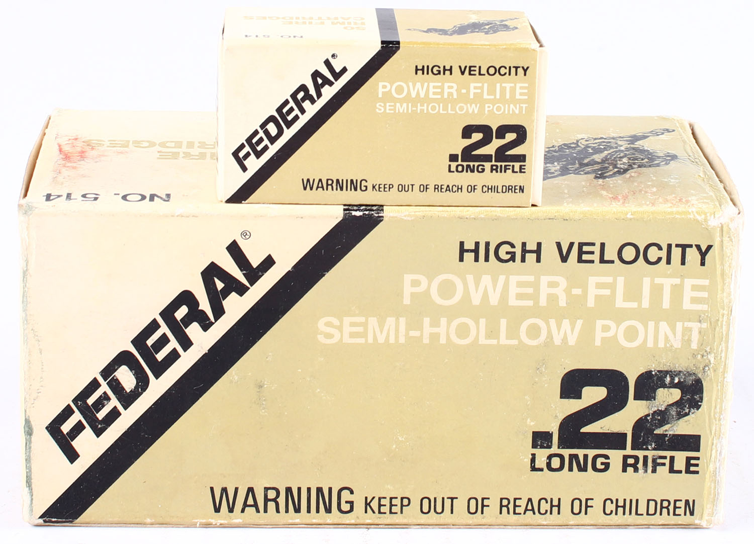 Federal, Power-Flite, .22 Long Rifle, High-Velocity, Semi-Hollow Point, Full, 500rds. 1pc. Bronze black & white brick, brick is solid with poor color, some shelf wear, some edge & corner wear, end flaps are solid, inside boxes are excellent. Grade: Good ++ - Value: 30 to 90