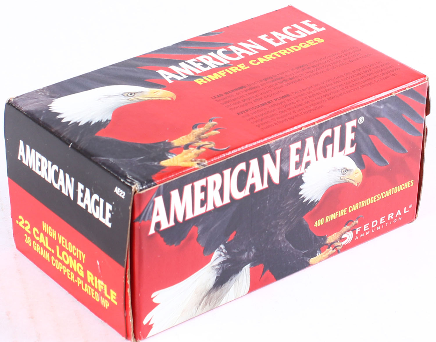 Federal, American Eagle, .22 Long Rifle, High Velocity, 38 Grain Copper-Plated HP, FULL & SEALED, 400rds., 1pc. Red & black brick, brick is MINT with minty color, corners are sharp, edges are crisp, end flaps are solid. Grade: MINT - Value: 20 to 60