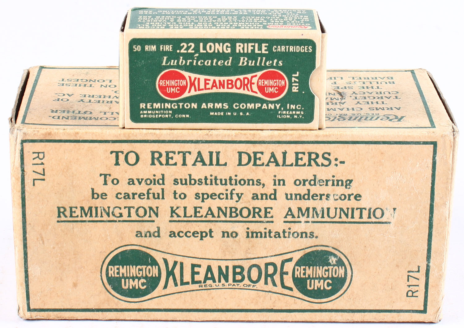 Remington, Kleanbore, .22 Long Rifle, Full, 1pc. Buff & green dog bone brick, brick is solid with excellent color, very minor shelf wear & scuffing, edges are crisp, end flaps are solid, inside boxes are minty. Grade: Excellent + - Value: 150 to 400