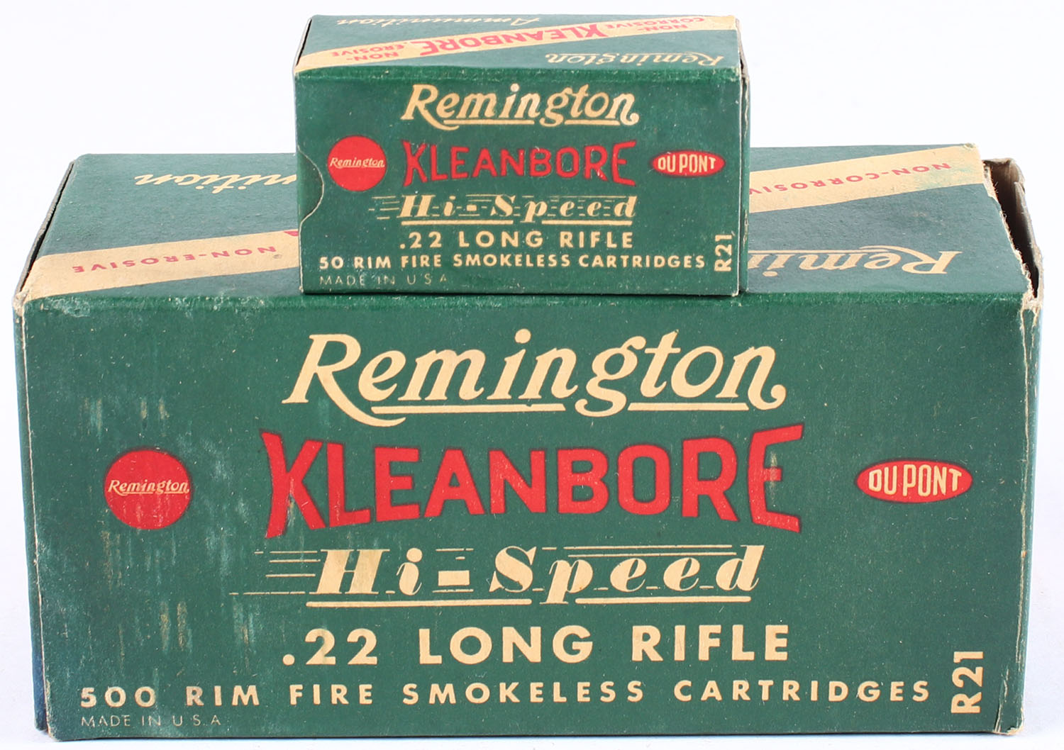 Remington, Kleanbore Hi-Speed, .22 Long Rifle, Full, 500rds. 1pc. Green buff & red brick, left end flap has a partial tear, brick has very good to excellent color, some age soiling, minor shelf wear, some corner wear, minor edge wear, right end flap is solid, inside boxes are excellent. Grade: Very Good ++ - Value: 100 to 200