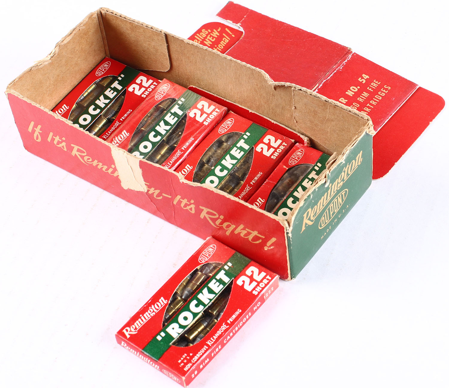 Remington, ''Rocket'', .22 Short, Partial, 140rds. (5 boxes), 1pc. Red white & green brick, brick is solid with very good to excellent color, minor age soiling & corner wear, edge wear, top flap is torn but included, inside boxes are good. Grade: Good - Value: 100 to 300