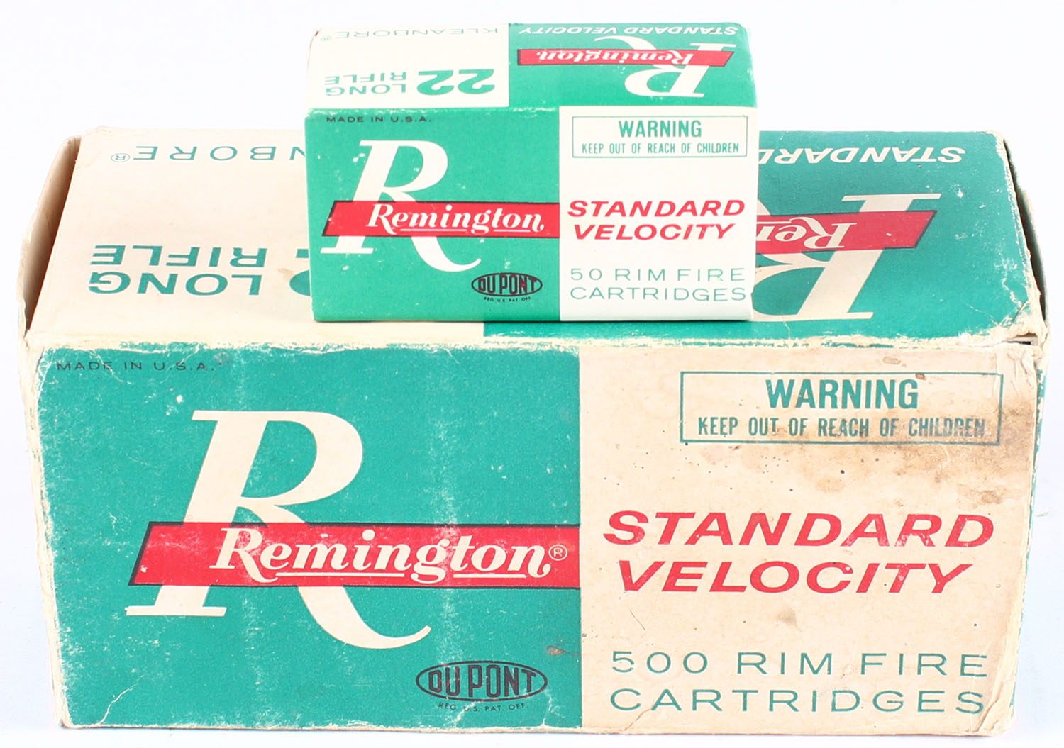 Remington, Standard Velocity Kleanbore, .22 Long Rifle, Full, 500rds., 1pc. Green white & red brick, brick is solid with good color, has age soiling & shelf wear, corner & edge wear, end flaps are solid, inside boxes are minty. Grade: Very Good - Value: 40 to 120