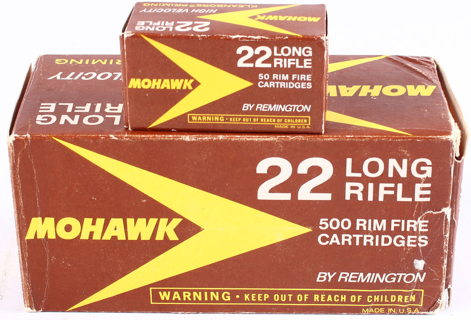 Remington, Mohawk, .22 Long Rifle, Full, 500rds, 1pc. Brown yellow & white brick, brick is solid with good to very good color, heavy shelf wear, some edge & corner wear, end flaps are solid, inside boxes are excellent. Grade: Very Good - Value: 40 to 120