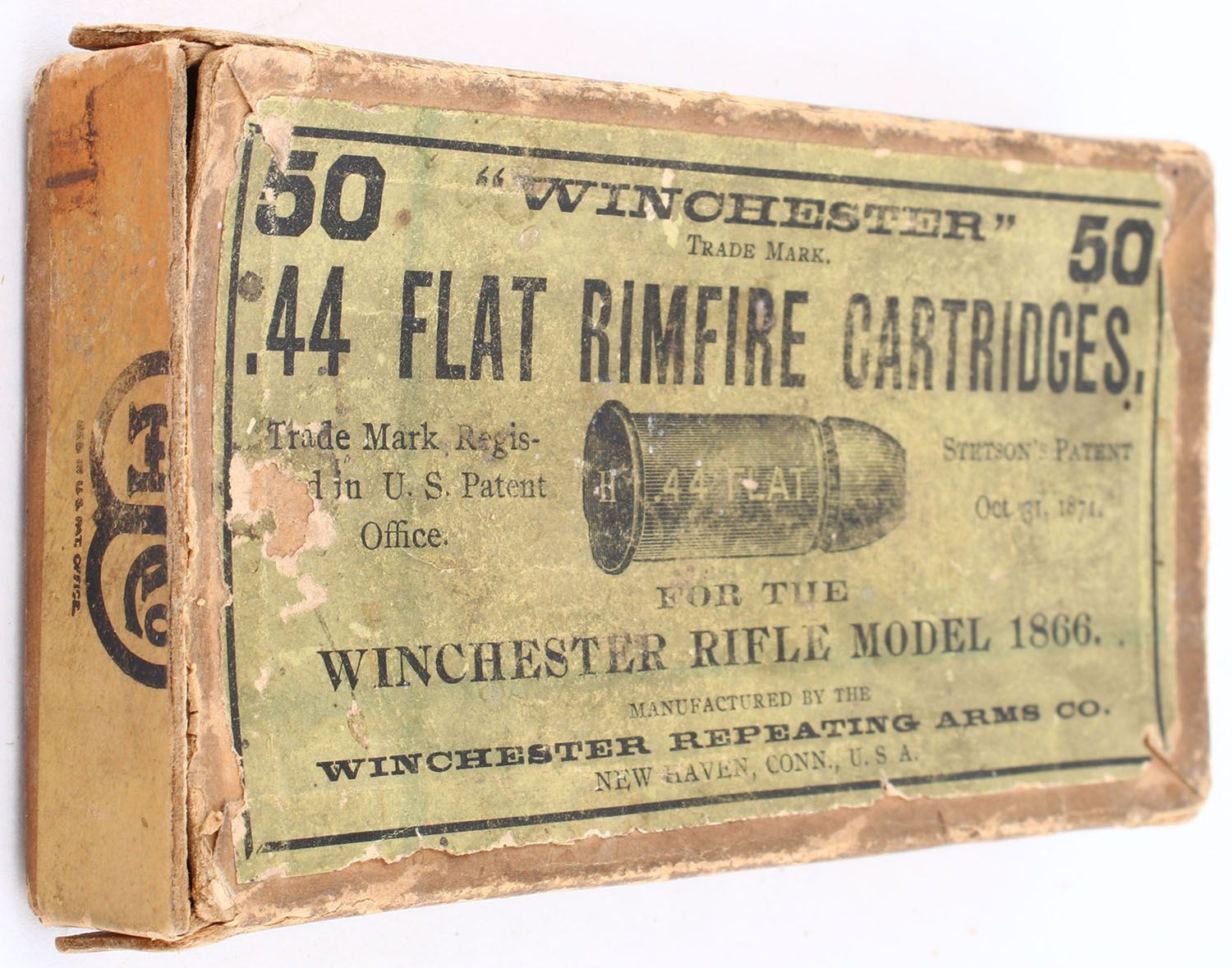RARE!!! Winchester 44 Flat Rim Fire, 2pc., Partial 10rds, Stetson's Patent Oct 31st 1871, .44 FLAT R.F. is printed on two sides, buff box with green top label & orange side labels, box has torn ends with age soiling to label, ammo is very good. Grade: Very Good - Value: 150 to 500