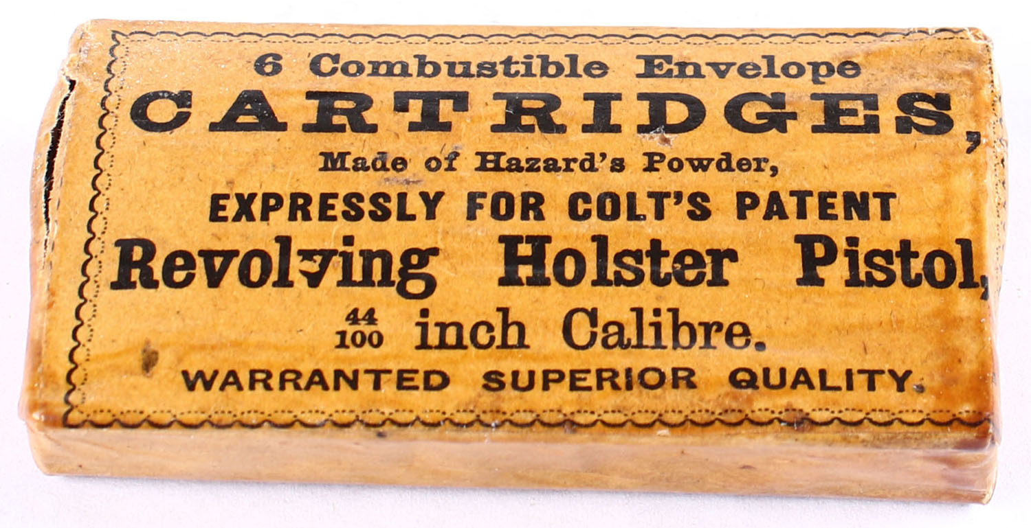 Combustible Envelope Cartridges, Made of Hazard's Powder, Expressly for Colt's Patent Revolving Holster Pistol, 44/100 inch Caliber, FULL & SEALED, 1pc. Buff packet with black printing, packet has been lacquered, very good color. Grade: Excellent - Value: 200 to 600