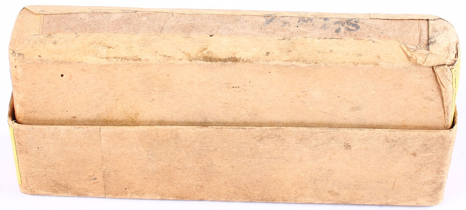 Winchester, .45-70 Winchester High Velocity, Low Pressure Smokeless Powder, 300 Gr. Soft-Point bullet, 2pc, Full, buff box with yellow label & black print, box is solid with nice colors, some light age soiling, Rare H/s: W.R.A.Co. 45-70 WHV with protected primers, ammo is excellent. Grade: Excellent - Value: 200 to 600