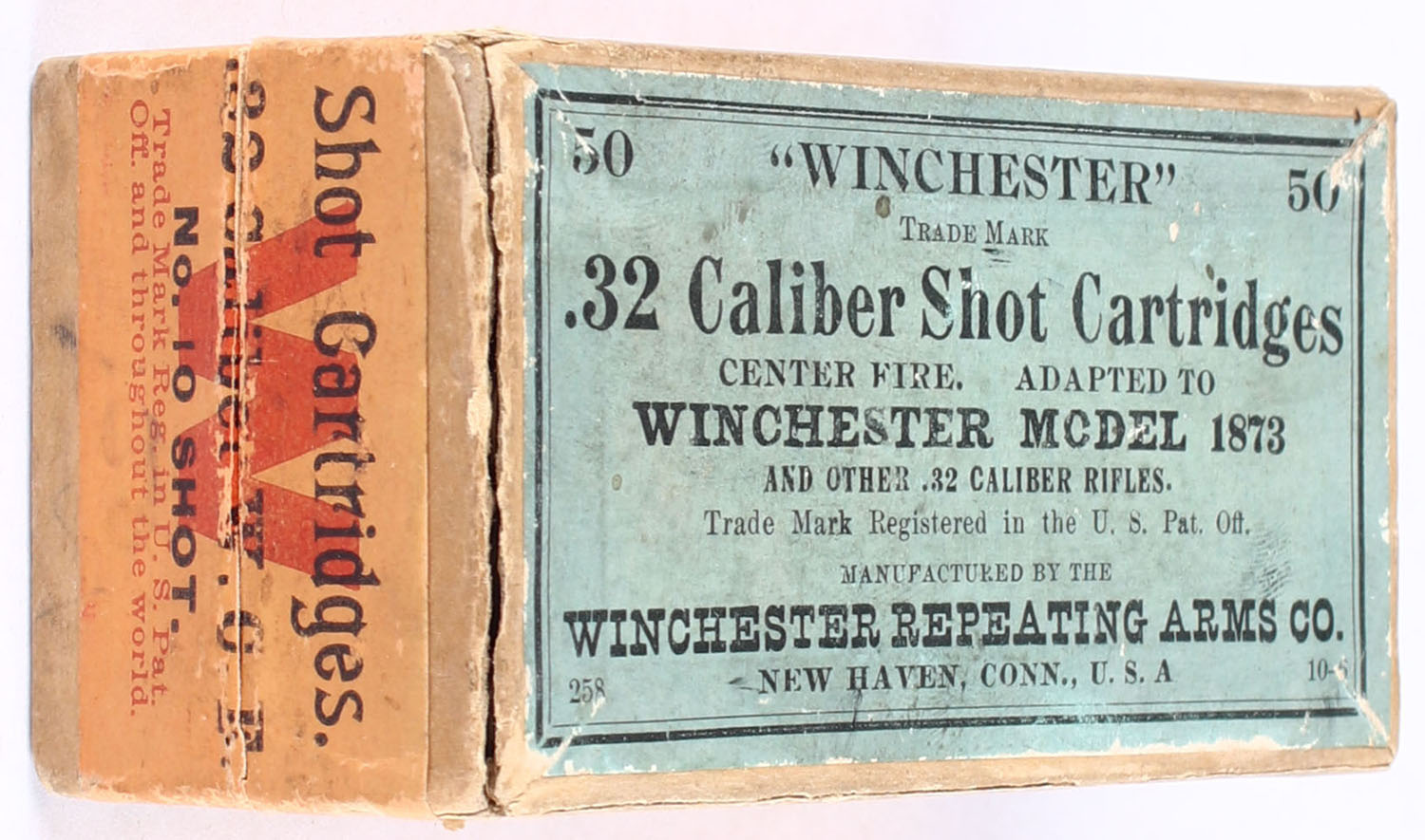 Winchester, .32 Shot Cartridges, Model 1873, No. 10 SHOT, 2pc, Full, buff box with blue/orange label & black print, box is solid with a clean seam split to one edge on top, nice color to label, ammo is excellent. Grade: Excellent - Value: 200 to 500