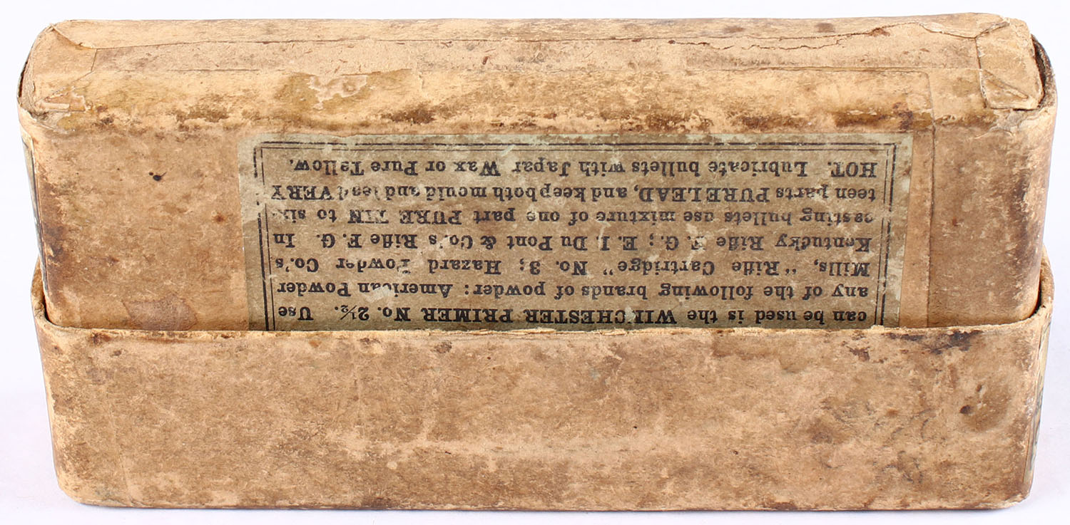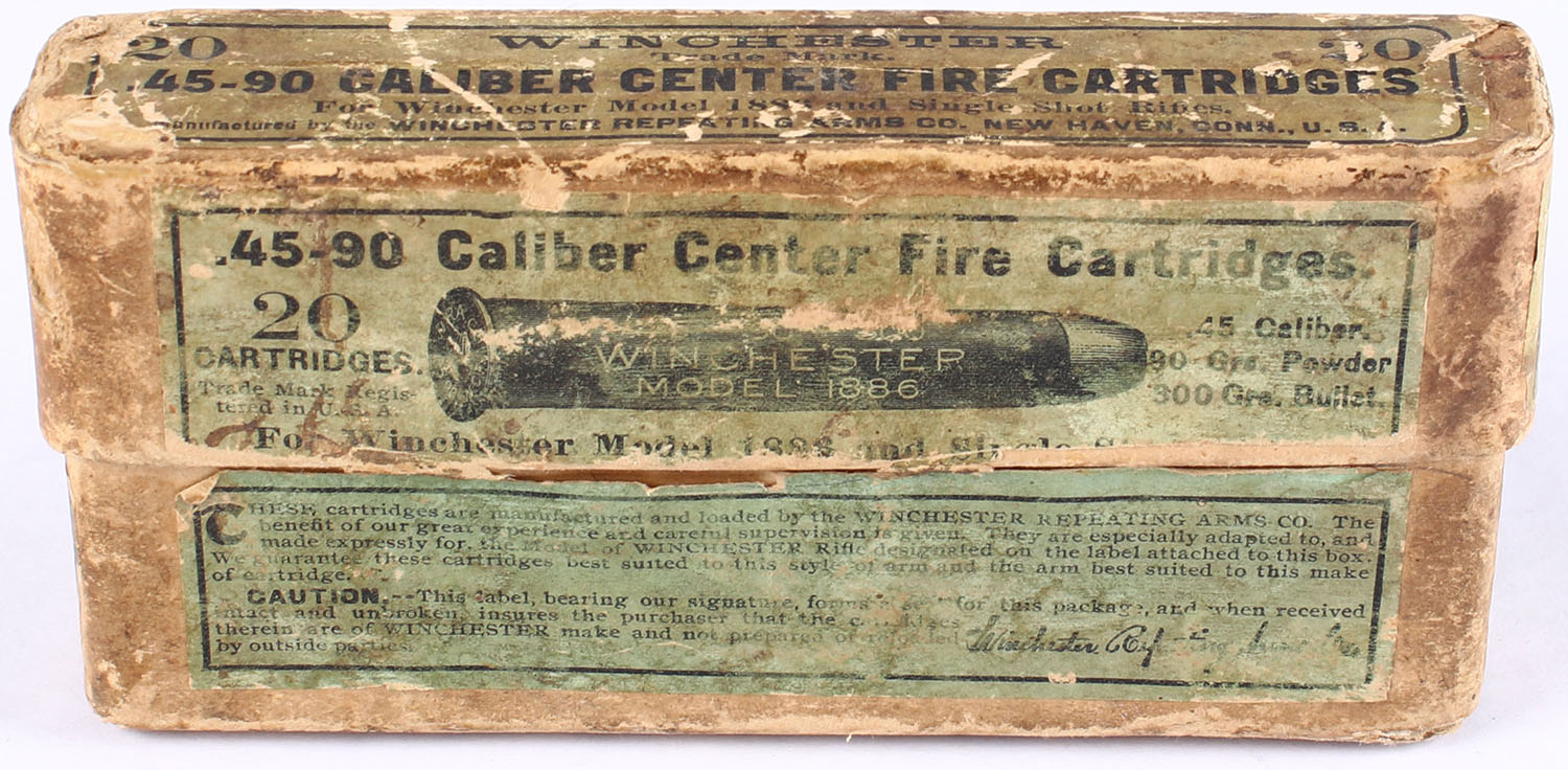 Winchester, .45-90, 300 Gr. bullet, 2pc, Full, buff box with green label & black print, box is solid with age soiling, rub marks & edge wear, ammo is excellent. Grade: Very Good + - Value: 100 to 300