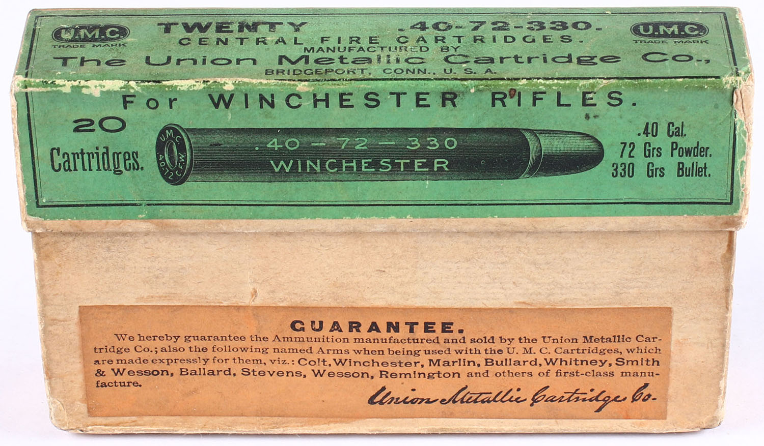 UMC, .40-72-330 Winchester, 330 Gr. Bullet, 2pc, Full, buff box with green label & black print, box is solid with great color to logo, ammo is excellent. Grade: Excellent + - Value: 100 to 200