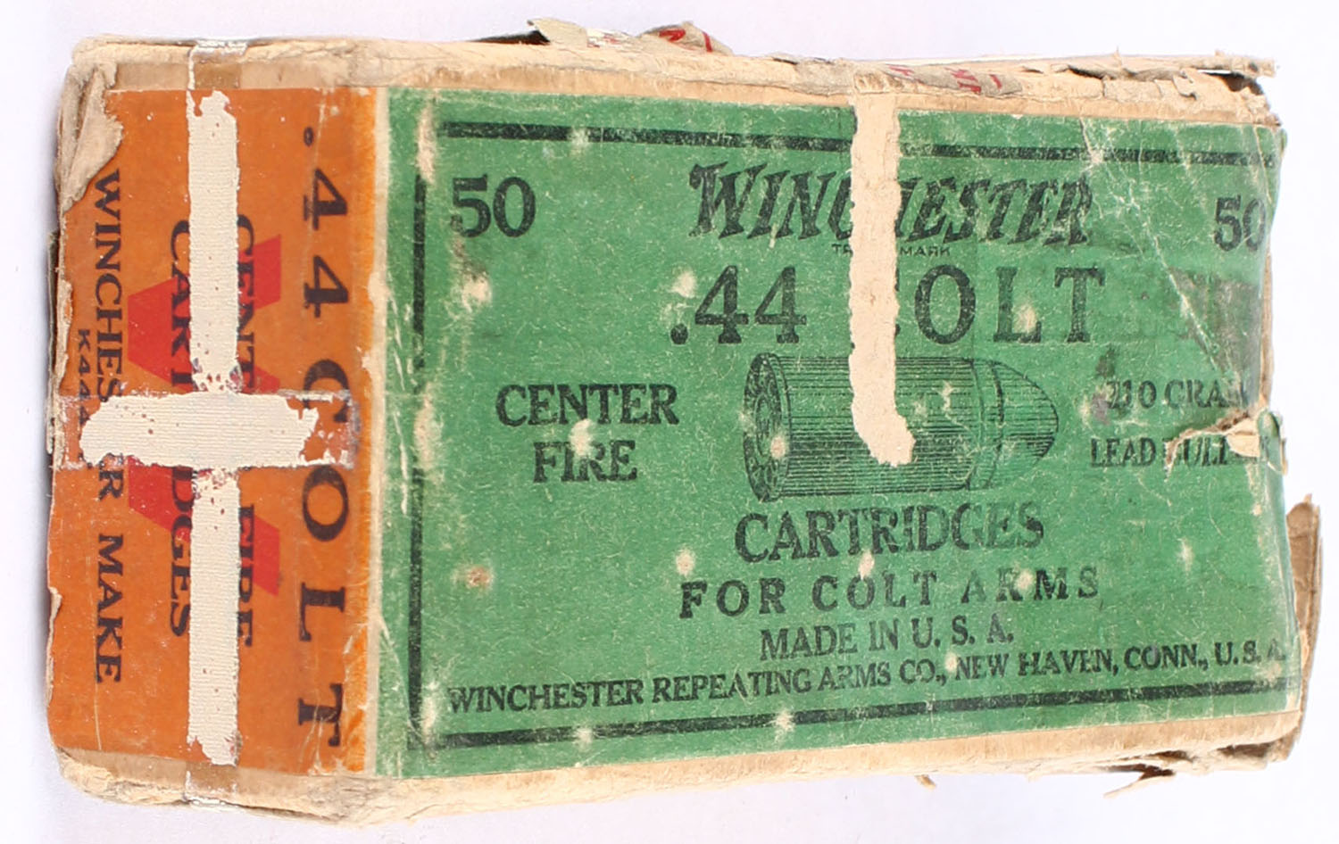 Winchester, .44 Colt, 210 Grain Lead Bullets, Partial 44rds., 2pc. Buff box with green & orange wraparound label, box ibis tattered with seam splits & one end missing, shows scuffing, label is ok, ammo is very good. Grade: Good ++ - Value: 50 to 150