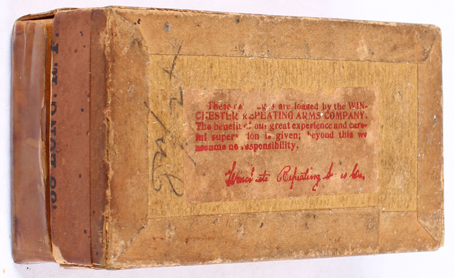 Winchester .38 Long R.F., 2pc, Full, buff box with green top label & orange side label with black print, box has tape repairs to top otherwise solid with age soiling, ammo is fair. Grade: Good - Value: 30 to 90