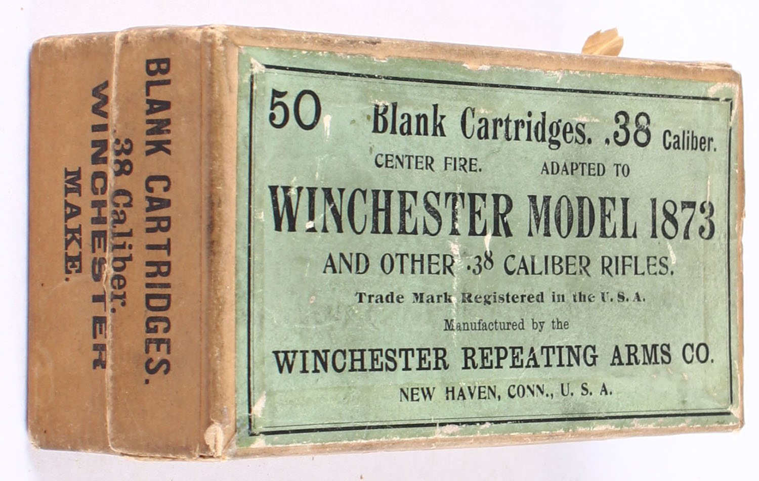 Winchester, .BLANK CARTS, .38 Cal., Winchester Model 1873, Full, 2pc. Buff box with green top & buff side sealing labels, box is very solid with nice color to label, one end label & top of end is missing, labels are 80% intact, ammo is excellent. Grade: Very Good ++ - Value: 50 to 150