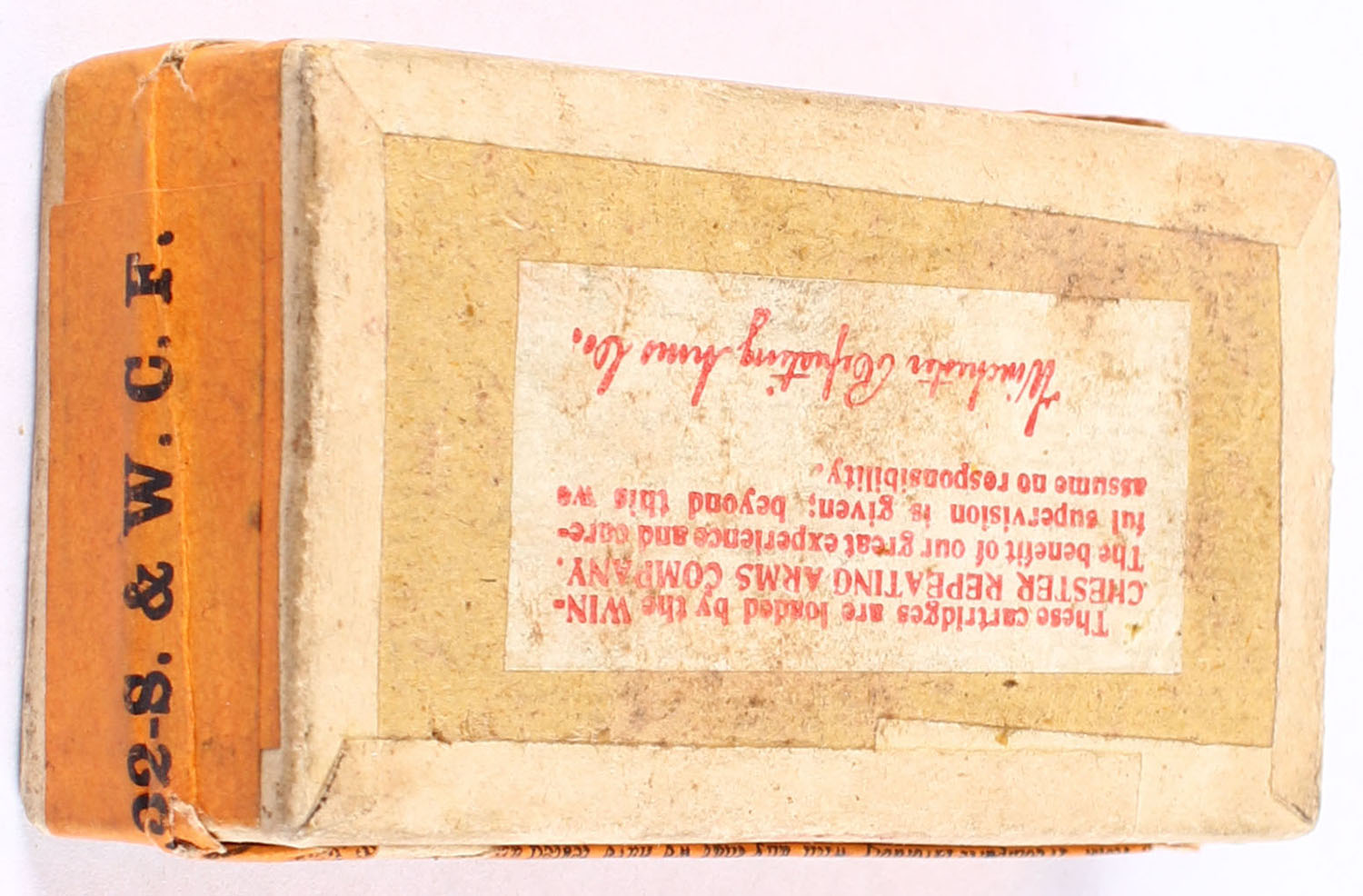 Winchester, Center Fire Cartridges, .32 Smith & Wesson, Solid Head, Full, 2pc. Buff box with green top & orange side sealing labels, box is solid with very good color, some staining on top, vertical seam splits to both left end corners of lid, some edge & corner wear, side sealing label is 75% intact, ammo is excellent. Grade: Very Good - Value: 20 to 60