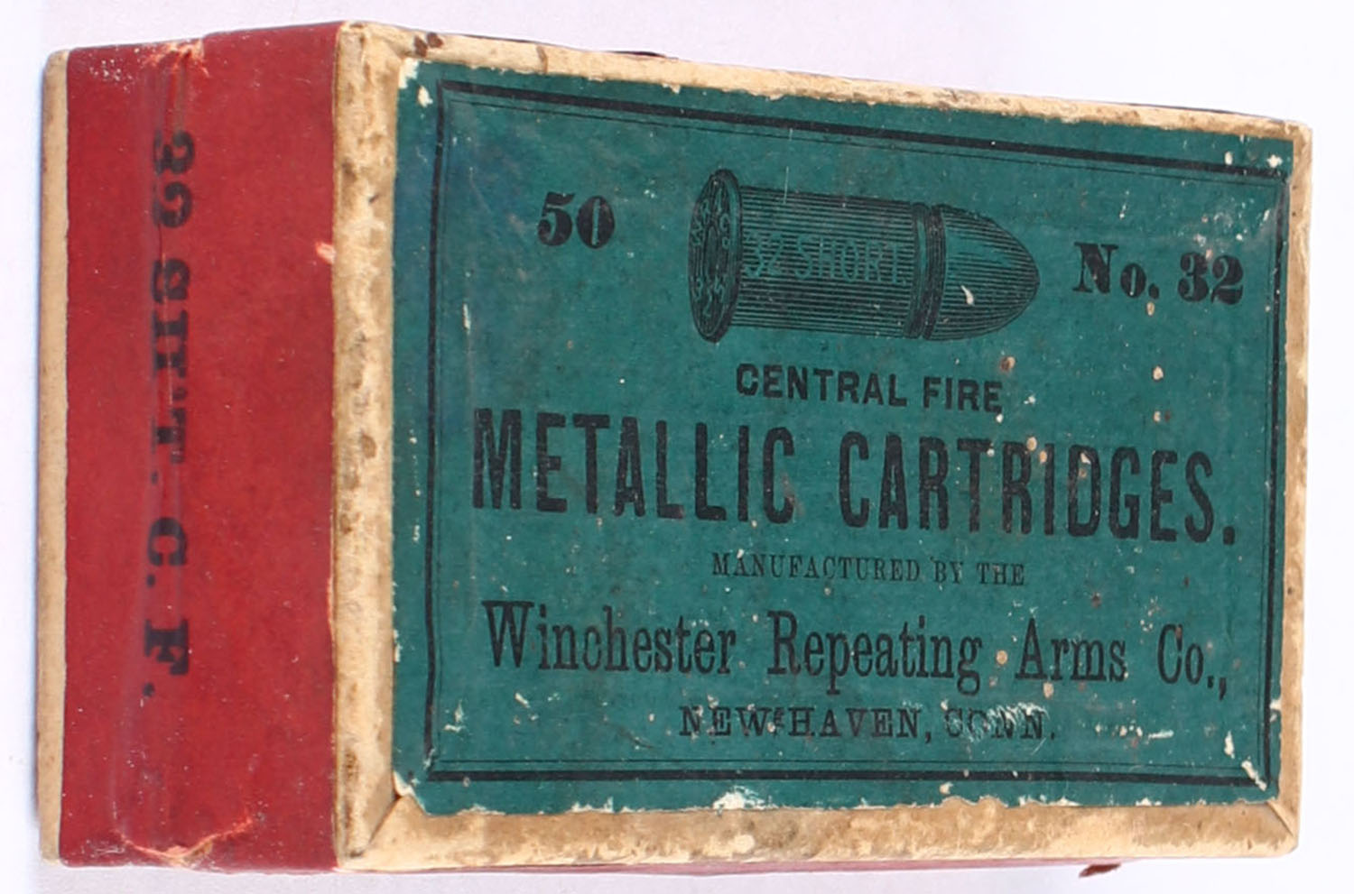 Winchester, Metallic Cartridges, .32 Short, Empty, 2pc. Buff box with green top & red side sealing labels, box is solid with very good color, some age soiling, minor shelf wear, minor edge & corner wear, labels are intact. Grade: Very Good ++ - Value: 8 to 40