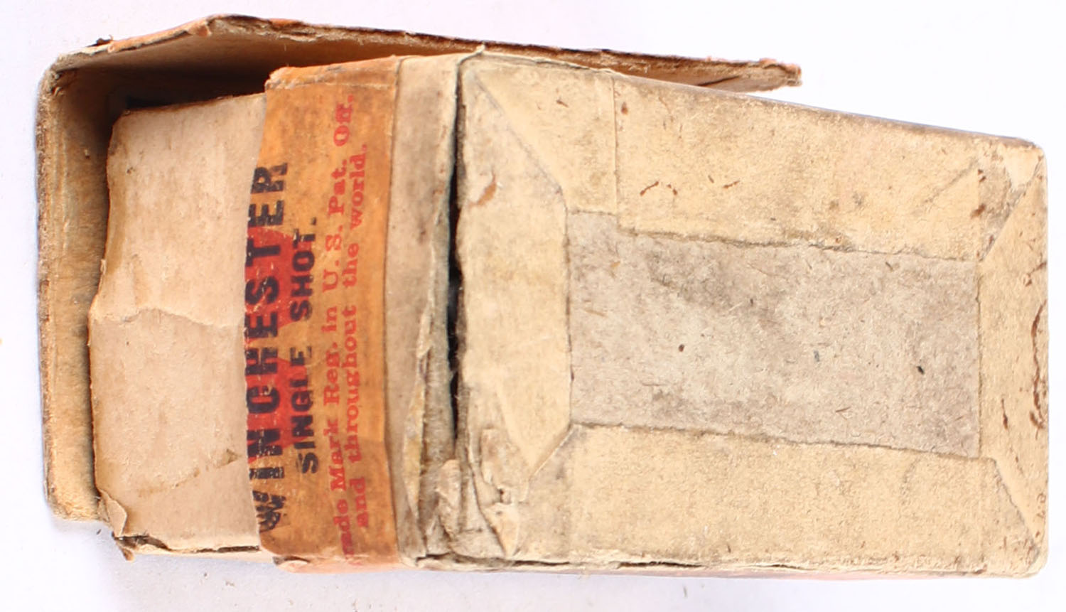 Winchester, Center Fire Cartridges, .22 Winchester Single Shot, Partial 48rds. 2pc. Buff box with green top & orange side sealing labels, lid is missing 3 sides, very good color, some age soiling, shelf wear, tear on top, edge & corner wear, side sealing label is 60% intact, ammo is excellent. Grade: Good - Value: 30 to 90