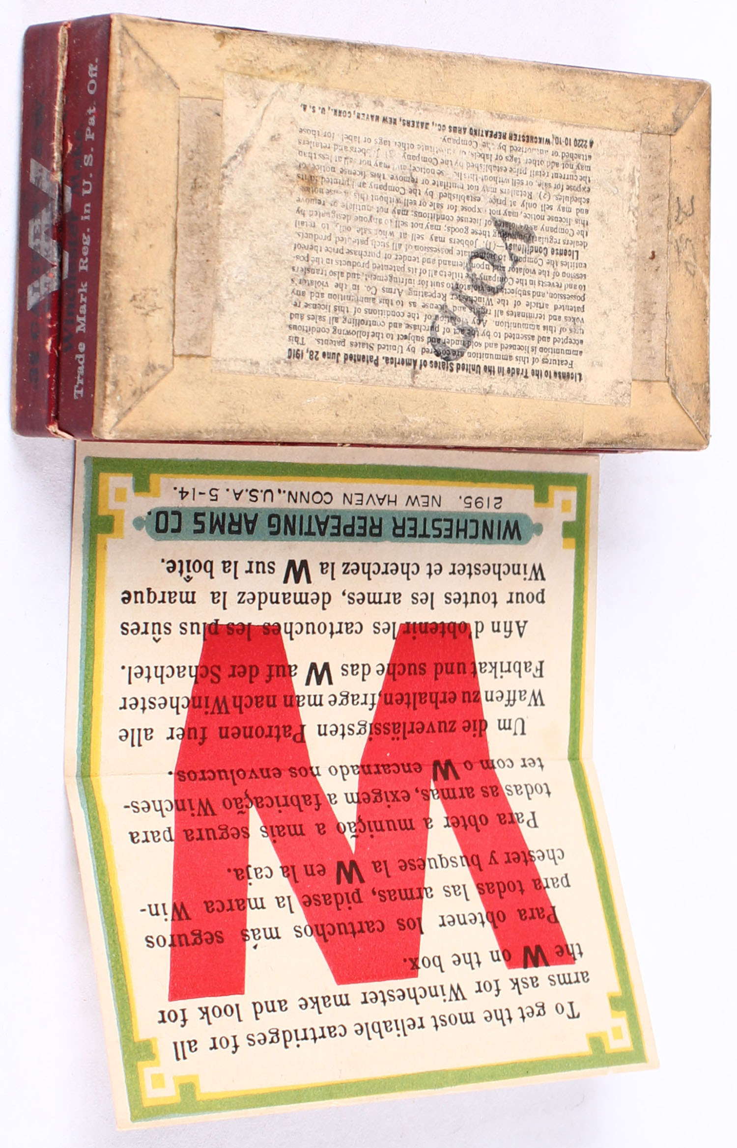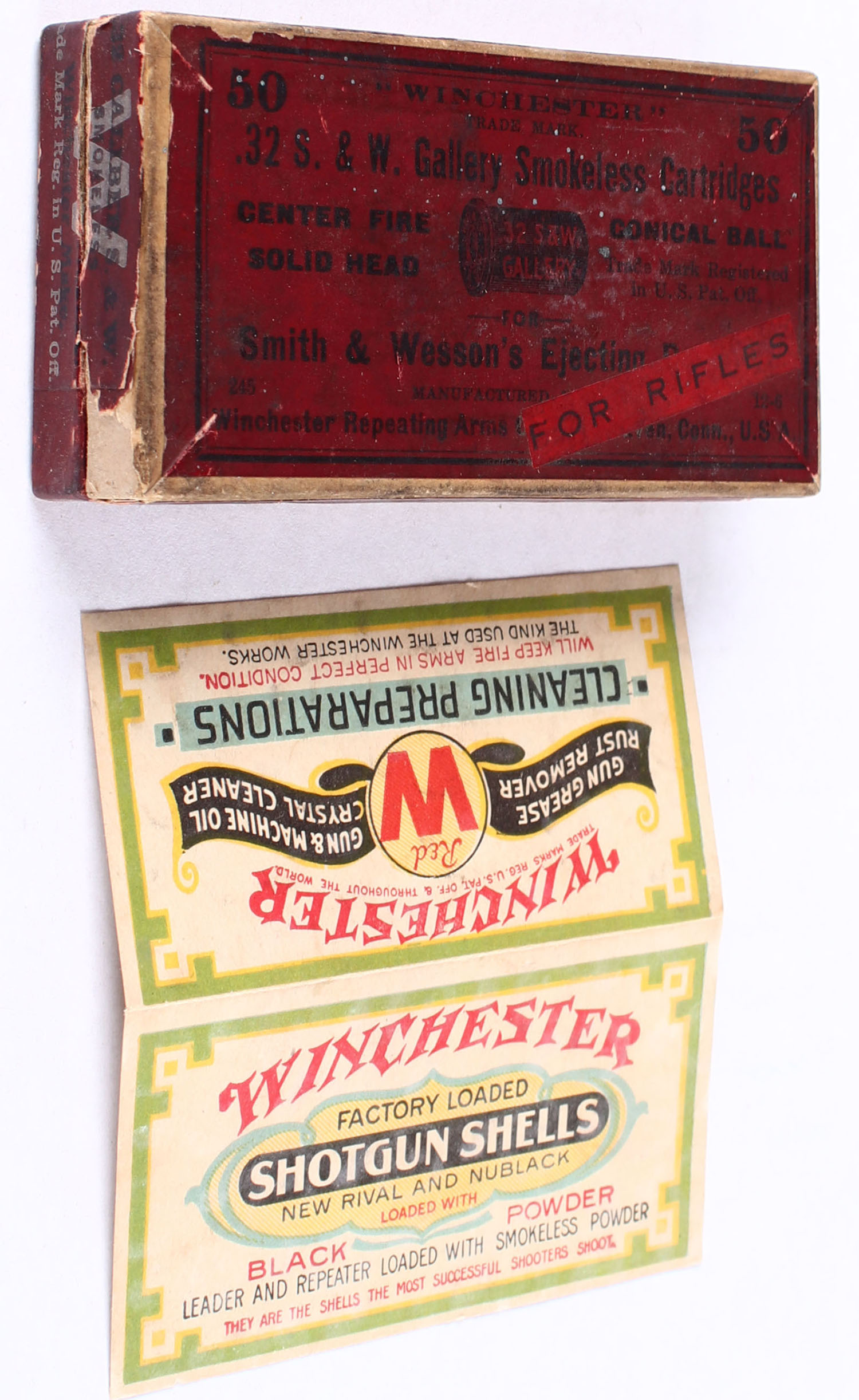 Winchester, .32 S & W Gallery Smokeless Cart., Conical Ball, OVER LABEL'' FOR RIFLES'', has insert, Full, 2pc. Buff box with red top & side sealing labels, box is solid with very good color, kind of dark but that is how they came, some age soiling, edges are crisp, label is intact, ammo is fair. Grade: Excellent - Value: 20 to 30