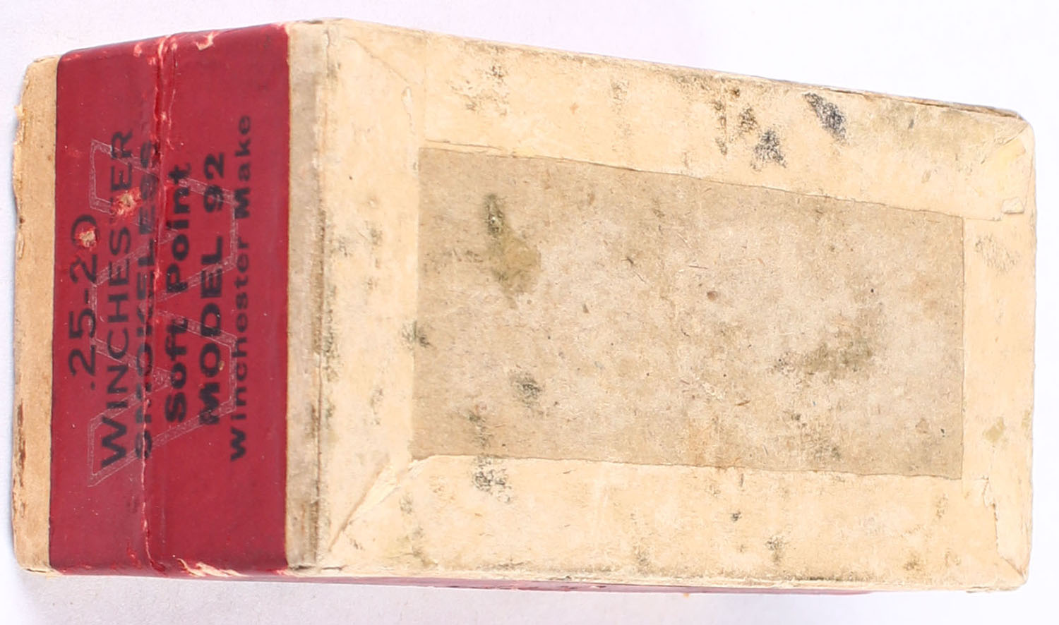 Winchester, Smokeless Cartridges, .25-20 Winchester, 86 Grain Winchester Soft Point, FULL & SEALED, 2pc. Buff box with red top & side sealing labels, box is solid with excellent color, minor shelf wear, some edge & corner wear, labels are intact. Grade: Excellent - Value: 200 to 400
