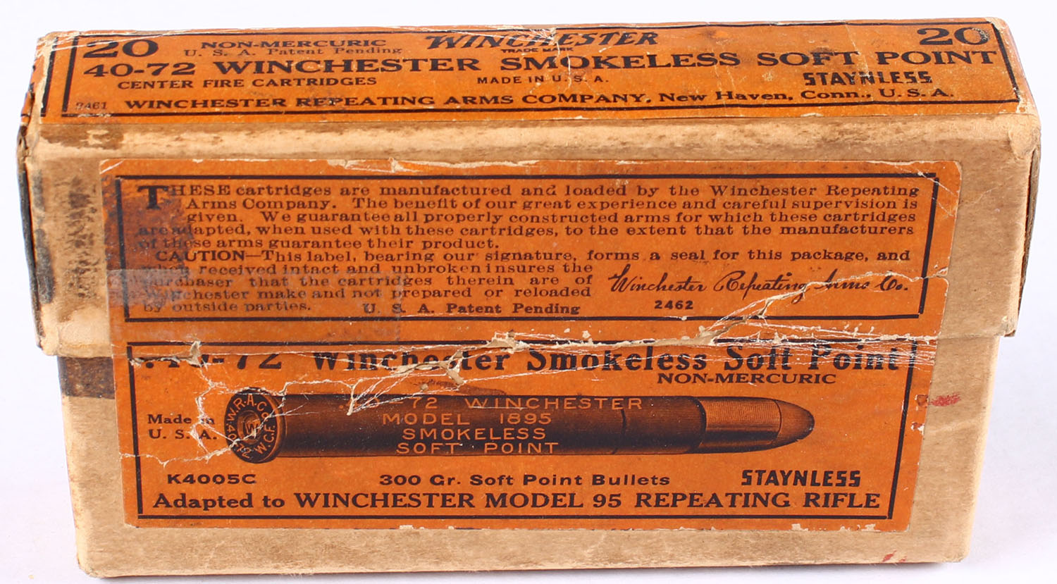Winchester, Center Fire Cartridges, .40-72 Winchester, Non-Mercuric, 300 Gr. Soft Point Bullets, Smokeless, Full, 2pc. Buff box with orange labels, box is solid with very good color, some shelf wear & staining, minor edge & corner wear, labels are intact, ammo is good. Grade: Very Good - Value: 30 to 90
