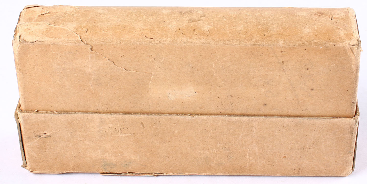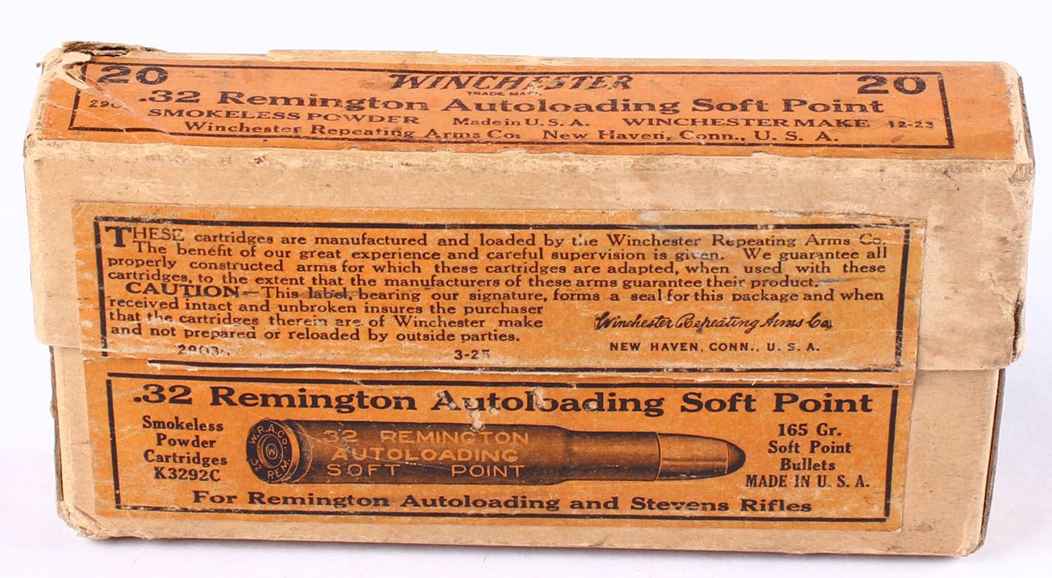 Winchester, Smokeless Powder Cartridges, .32 Remington Autoloading, 165 Gr. Soft Point Bullets, Full, 2pc. Buff box with orange labels, box is solid with very good to excellent color, minor color fading & edge wear, some corner wear, labels are intact, ammo is fair - corroded with cracked necks. Grade: Very Good ++ - Value: 20 to 60