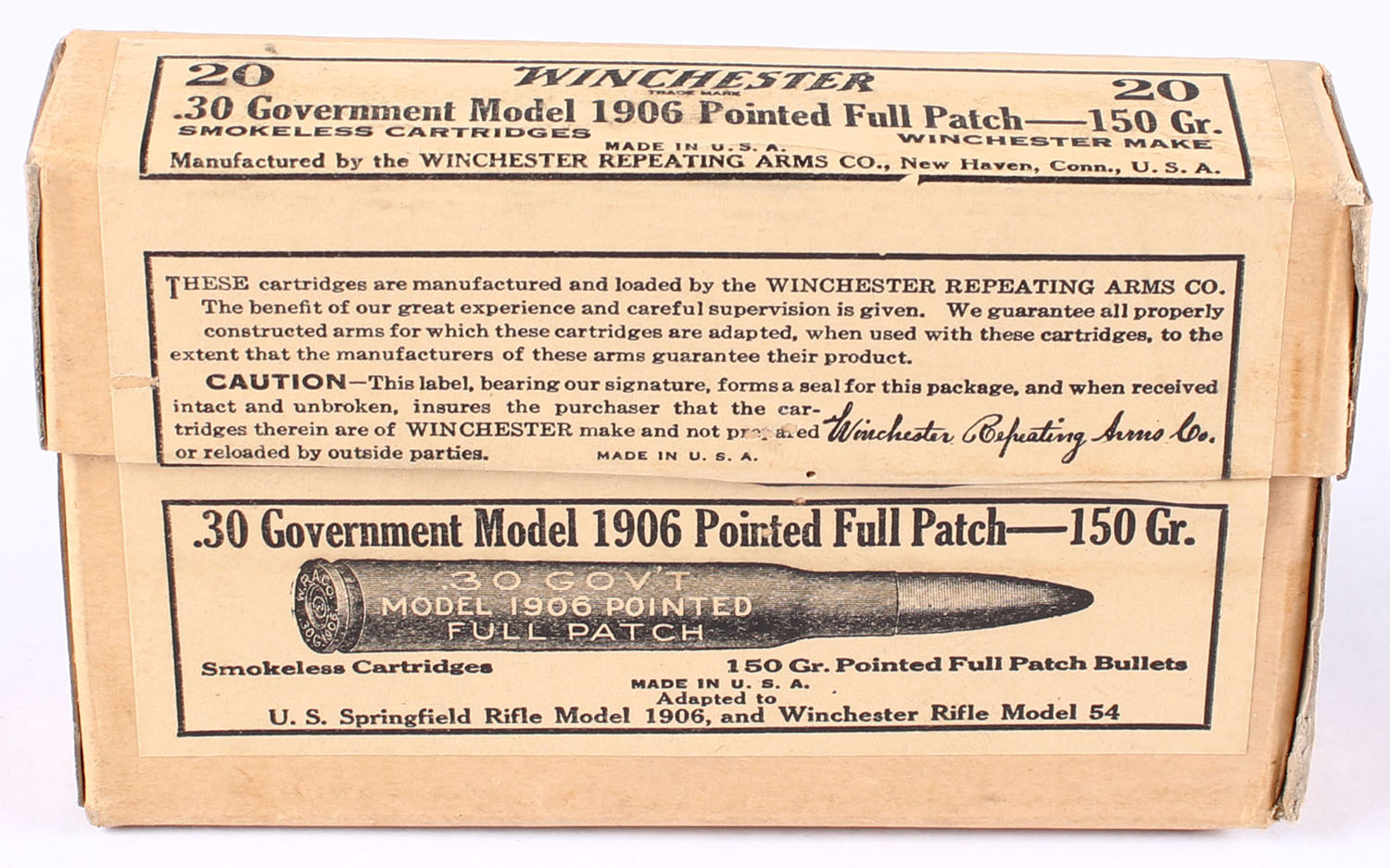 Winchester, Smokeless Cartridges, .30 Government Model 1906 (.30-06), 150 Gr. Full Patch, FULL & SEALED, 2pc. Buff box with buff label, box is solid with excellent color, very minor corner wear, edges are crisp, label is intact. Grade: Excellent + - Value: 30 to 90