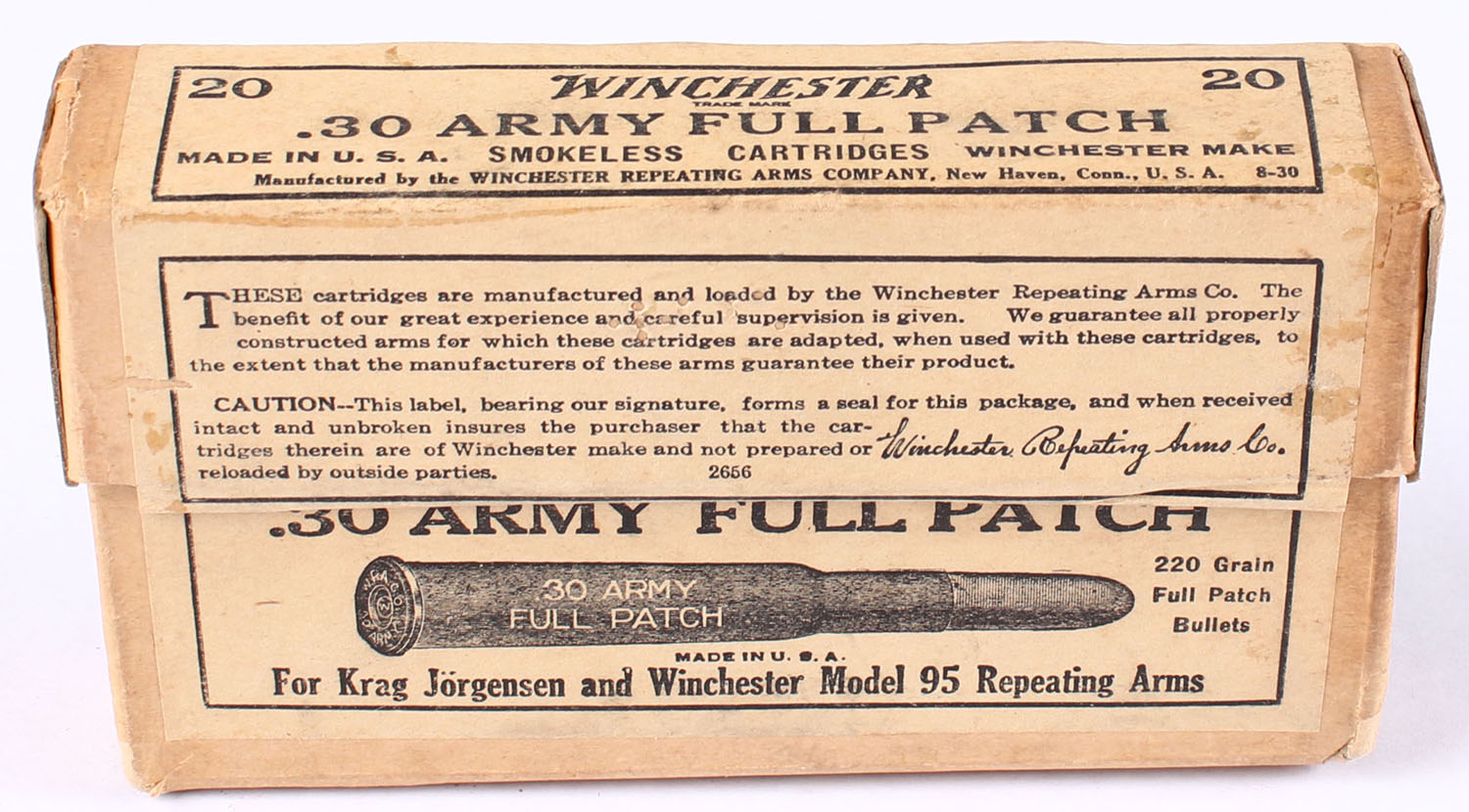 Winchester, Smokeless Cartridges, .30 Army (.30-40 Krag), 220 Grain Full Patch Bullets, FULL & SEALED, 2pc. Buff box with buff labels, box is solid with excellent color, minor corner wear, edges are mostly crisp, labels are intact. Grade: Excellent - Value: 30 to 90