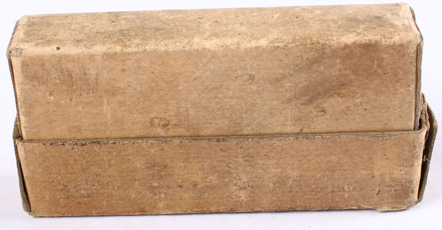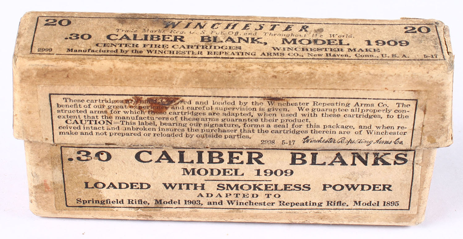 Winchester, Center Fire Cartridges, .30 Caliber Blank, Smokeless Powder, Partial 19rds. 2pc. Buff box with buff labels, box is solid with very good color, some staining & age soiling, some corner wear, minor edge wear, labels are intact, ammo is excellent. Grade: Very Good - Value: 20 to 60