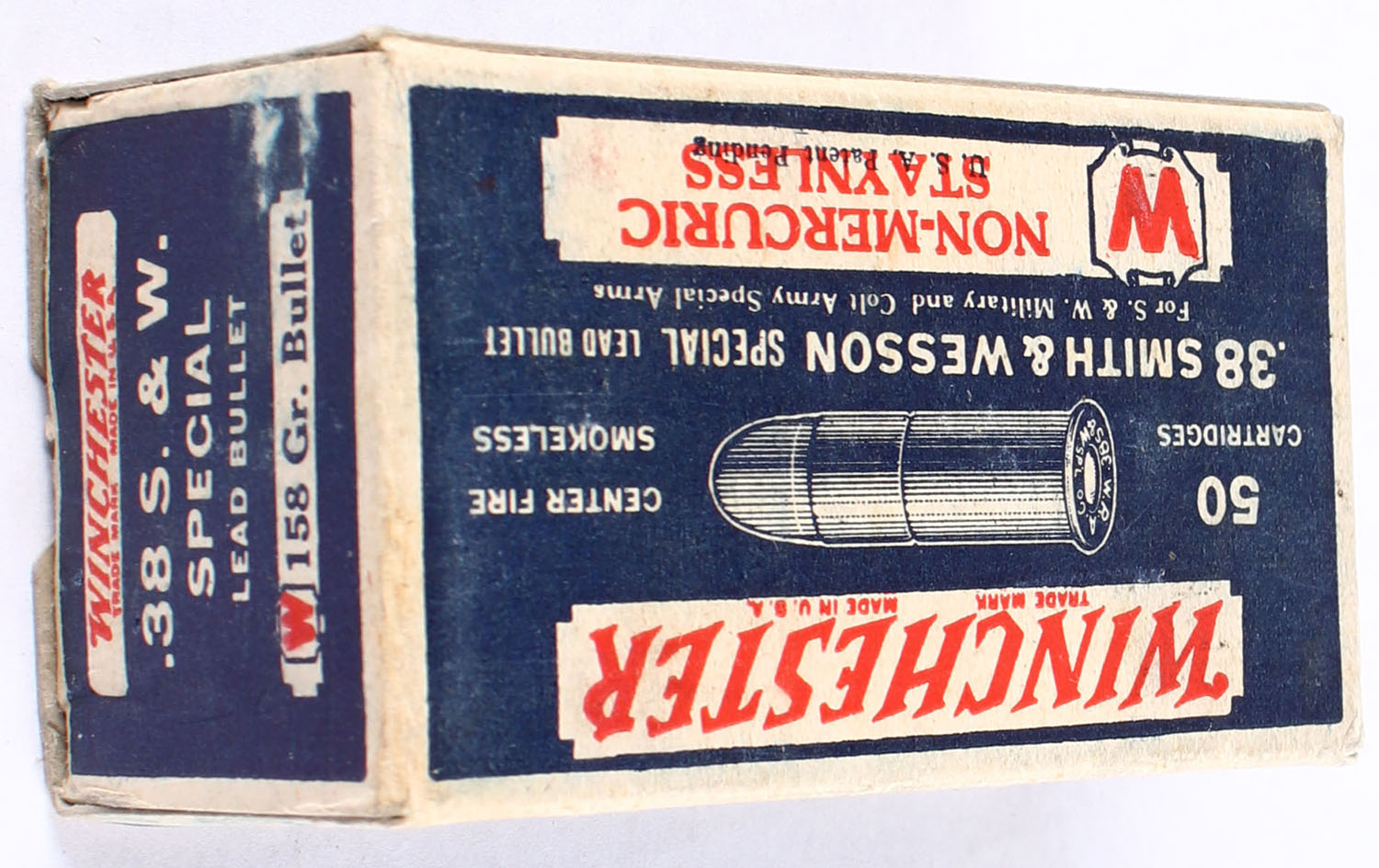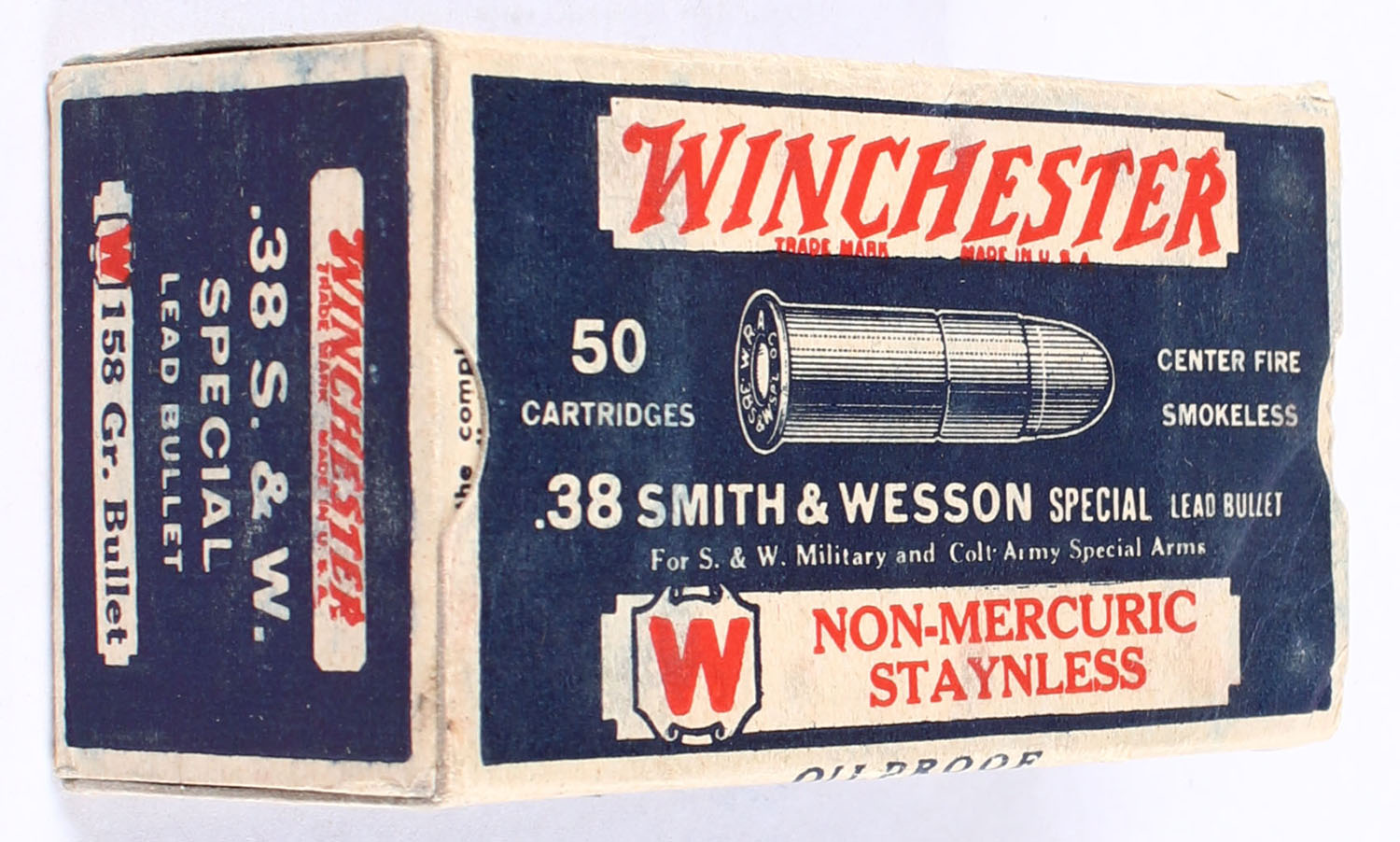 Winchester, Non-Mercuric Staynless, .38 Smith & Wesson Special, Oilproof, 158 Gr. Lead Bullet, Full, 1pc. Blue white & red box, box is solid with excellent color, minor shelf & corner wear, edges are mostly crisp, partial tear to insert tab of right end flap, left end flap is solid, ammo is excellent. Grade: Very Good ++ - Value: 30 to 90
