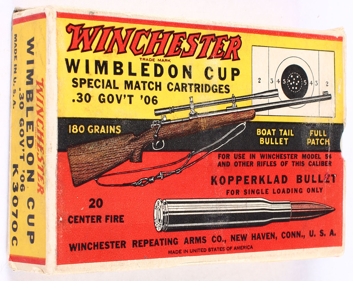 Winchester, Wimbledon Cup Special Match Cartridges, .30 Gov't '06 (.30-06), 180 Grain Full Patch Boat Tail Kopperklad Bullet, For Single Loading Only, Full, 1pc., red yellow & black box, box is solid with excellent color, end flaps are solid, ammo is excellent. Grade: Excellent + - Value: 150 to 300