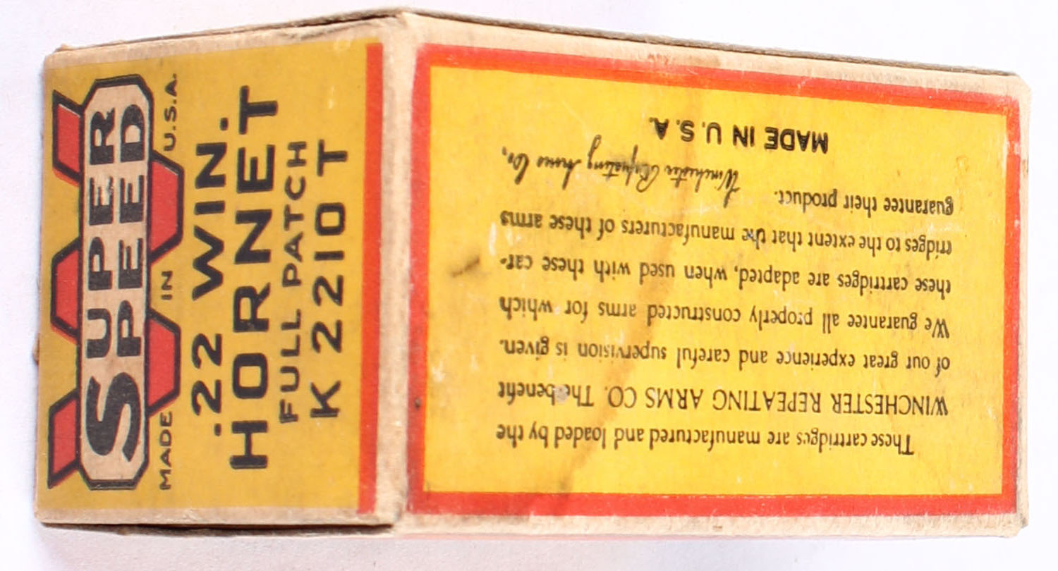 Winchester, Super Speed, .22 Winchester Hornet, 46 Grain Hollow Point, Full, 1pc., has insert, yellow red & black box, box is solid with very good to excellent color, minor shelf wear, very minor corner wear, edges are mostly crisp, end flaps are solid, ammo is excellent. Grade: Excellent - Value: 100 to 300