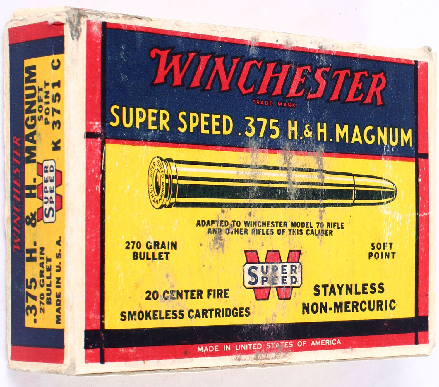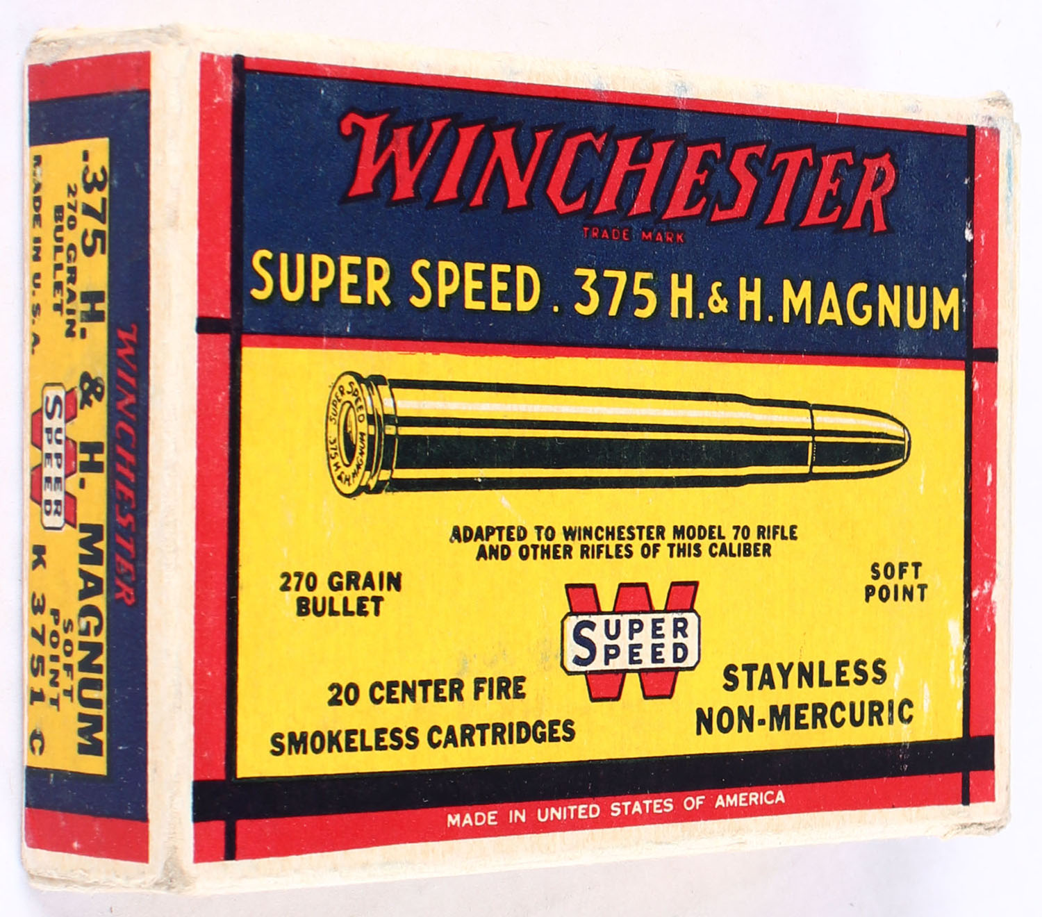 Winchester, Super Speed, .375 H&H Magnum, 270 Grain Soft Point Bullet, Full, 1pc. Yellow blue & red box, box is solid with excellent color, very minor shelf & edge wear, some corner wear, end flaps are solid, ammo is excellent. Grade: Excellent + - Value: 80 to 120