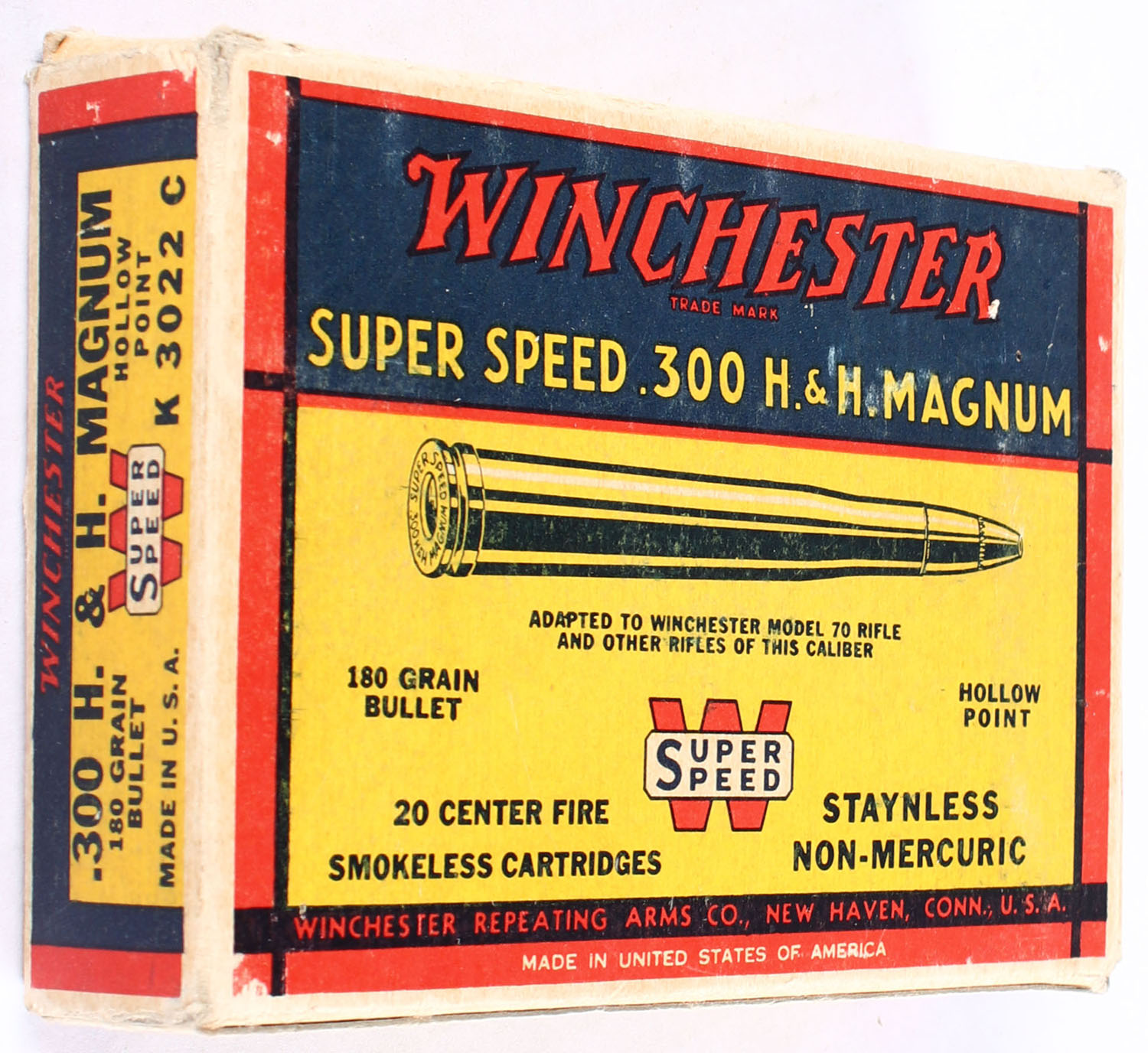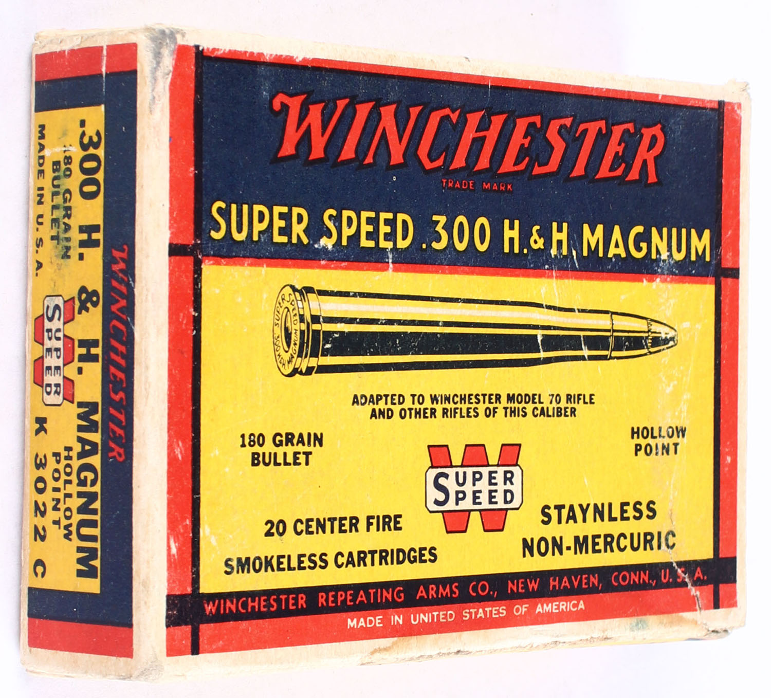 Winchester, Super Speed, .300 H&H Magnum, 180 Grain Hollow Point Bullet, Full, 1pc. Yellow blue & red box, box is solid with excellent color, some shelf wear & staining, tear on top, some corner wear, edges are crisp, end flaps are solid, ammo is excellent. Grade: Very Good + - Value: 50 to 150