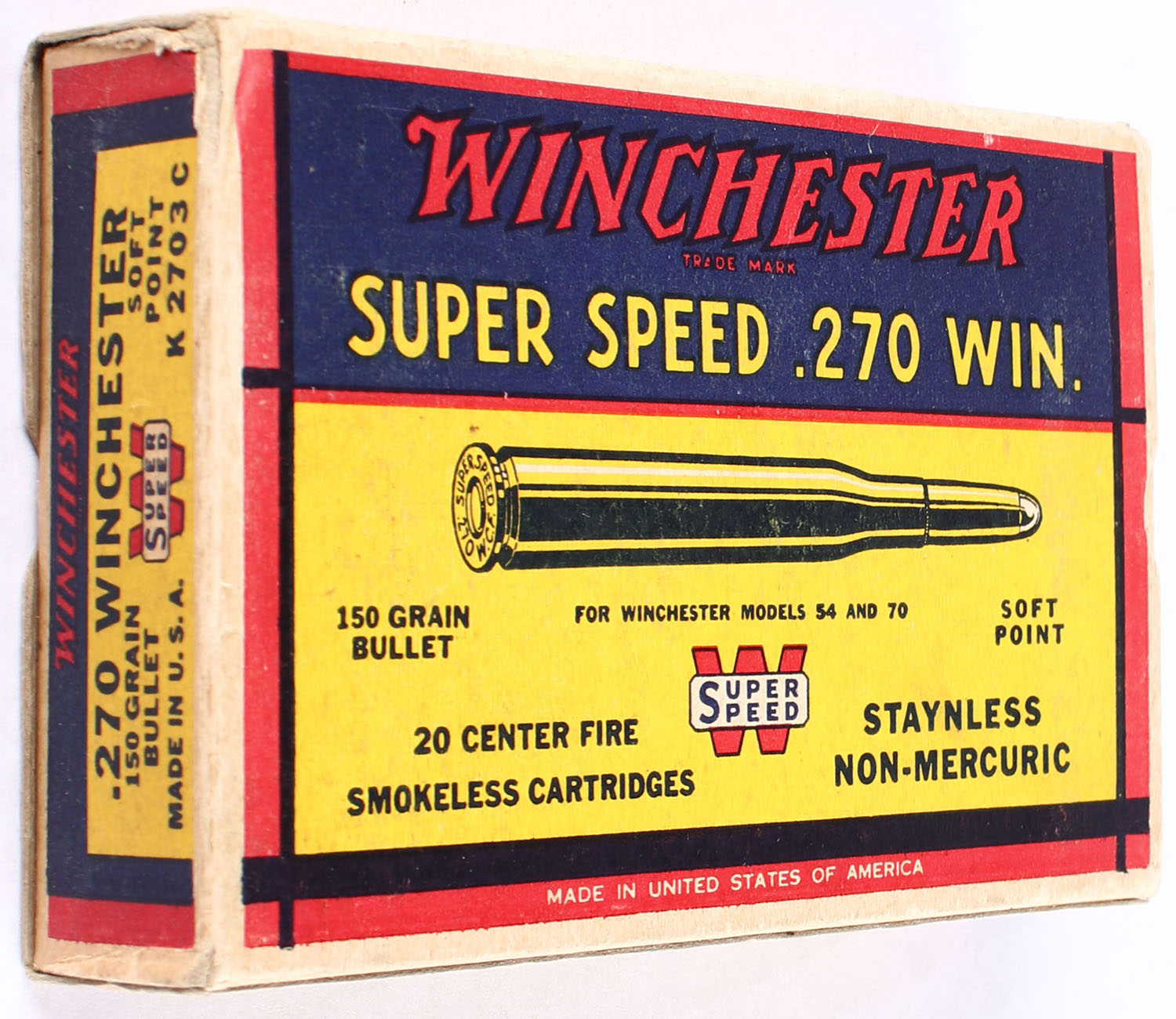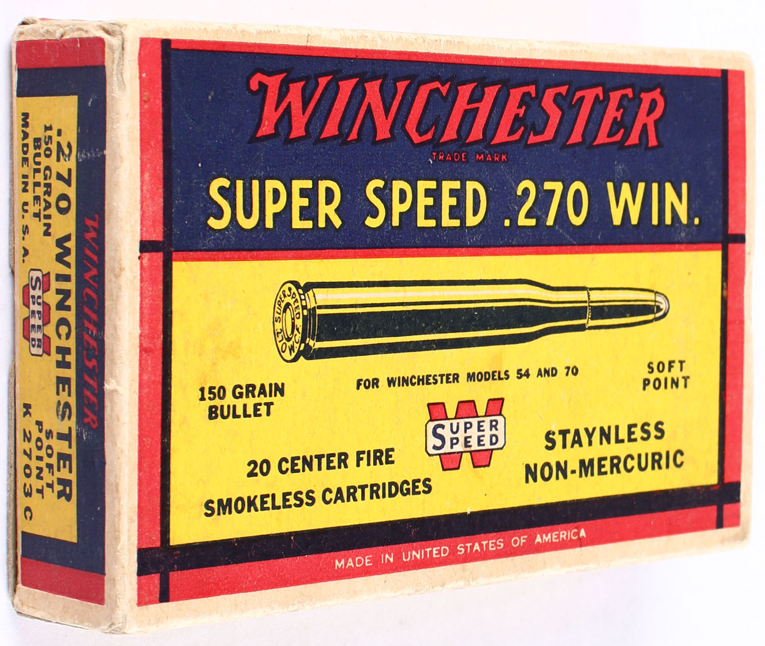 Winchester, Super Speed, .270 Winchester, 150 Grain Soft Point Bullet, Full, 1pc. Yellow blue & red box, box is solid with excellent color, very minor age soiling, minor edge & corner wear, end flaps are solid, ammo is excellent. Grade: Excellent - Value: 20 to 60