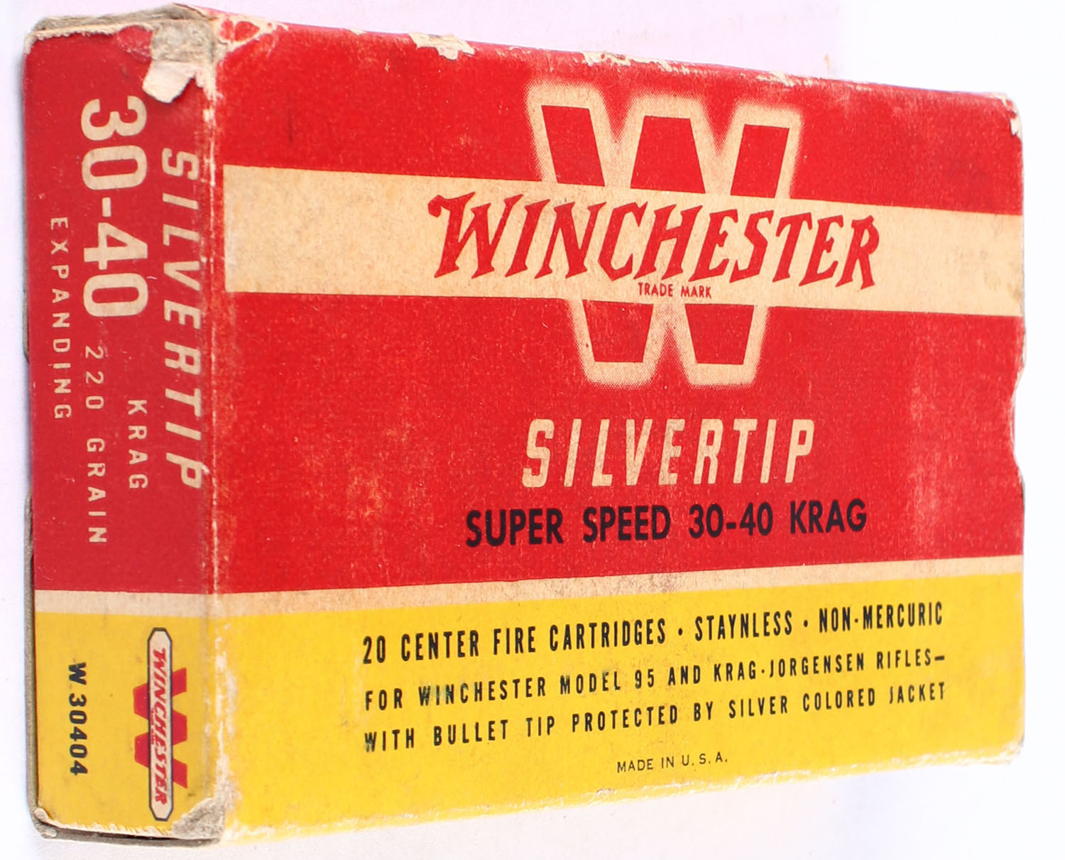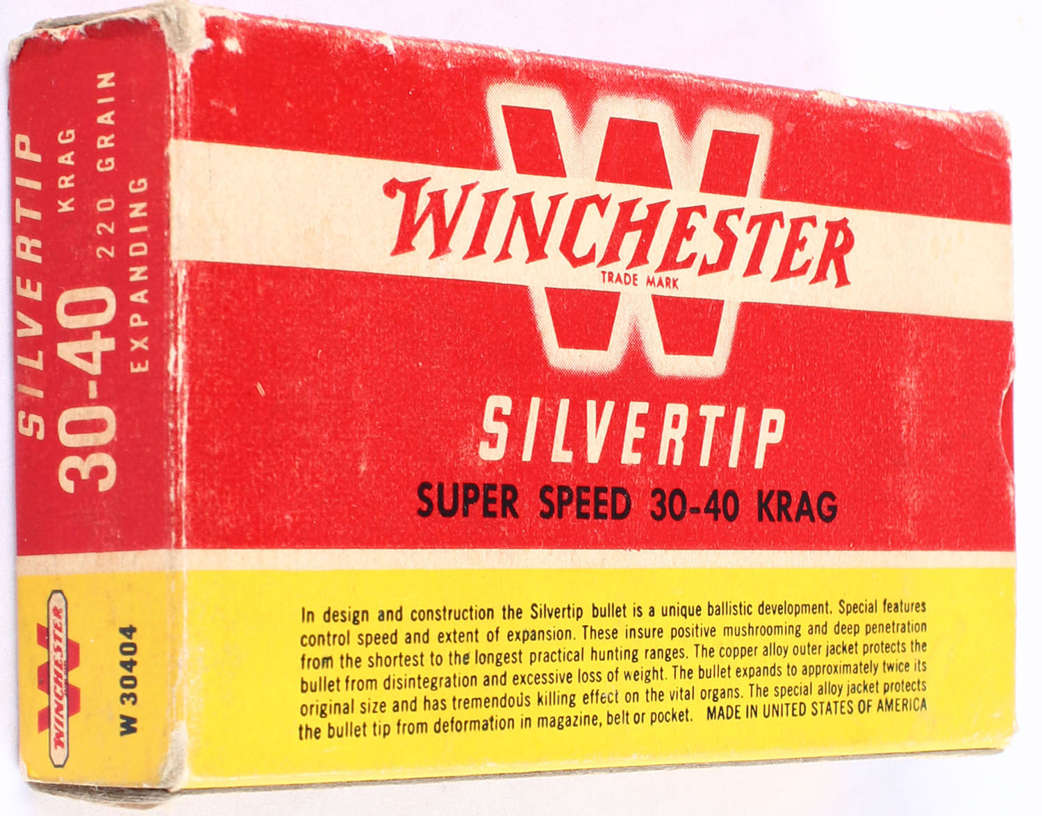 Winchester, Silvertip, .30-40 Krag (.30 Army), 220 Grain Controlled Expanding, Full with 19rds. being correct, 1pc. Red yellow & white box, box has shelf wear with edge & corner wear, end flaps are solid, ammo is excellent. Grade: Very Good - Value: 40 to 60