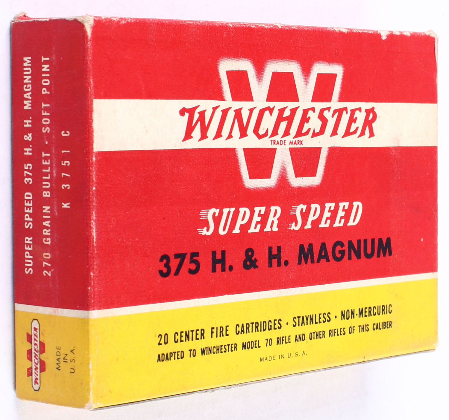 Winchester, Super Speed, 375 H. H. Magnum, 270 Grain Soft Point, Full, 1pc. Red yellow & white box, box is very solid with excellent color, has vey minor edge wear, end flaps are solid, ammo is excellent. Grade: Excellent + - Value: 40 to 60