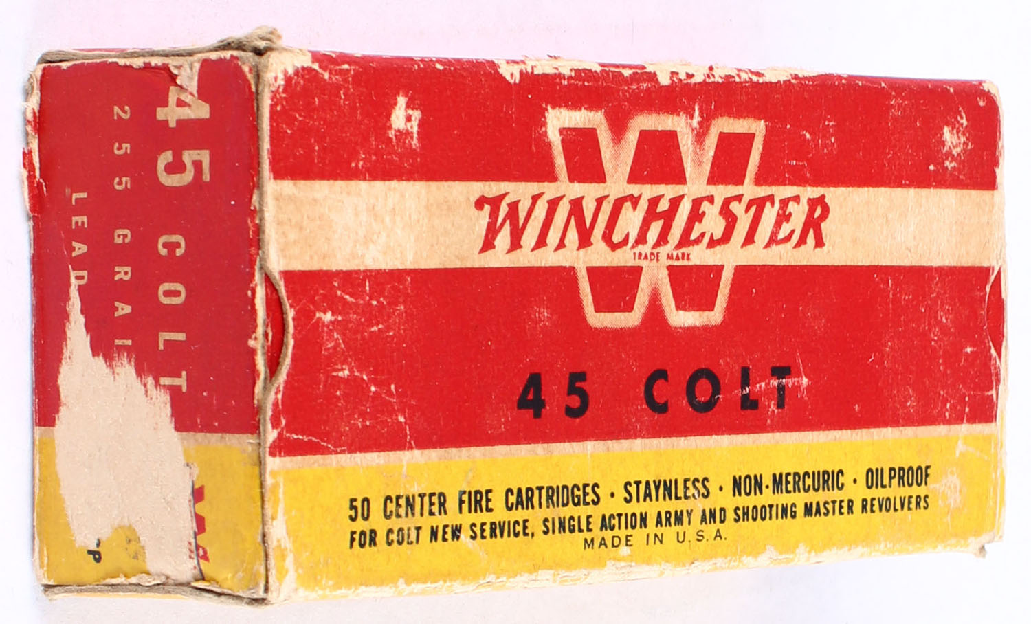 Winchester, Center Fire Cartridges, .45 Colt, 255 Grain Lead Bullet, Full, 1pc. Red yellow & white box, box has some age soiling & edge wear with corner wear, ammo is excellent. Grade: Very Good - Value: 40 to 60