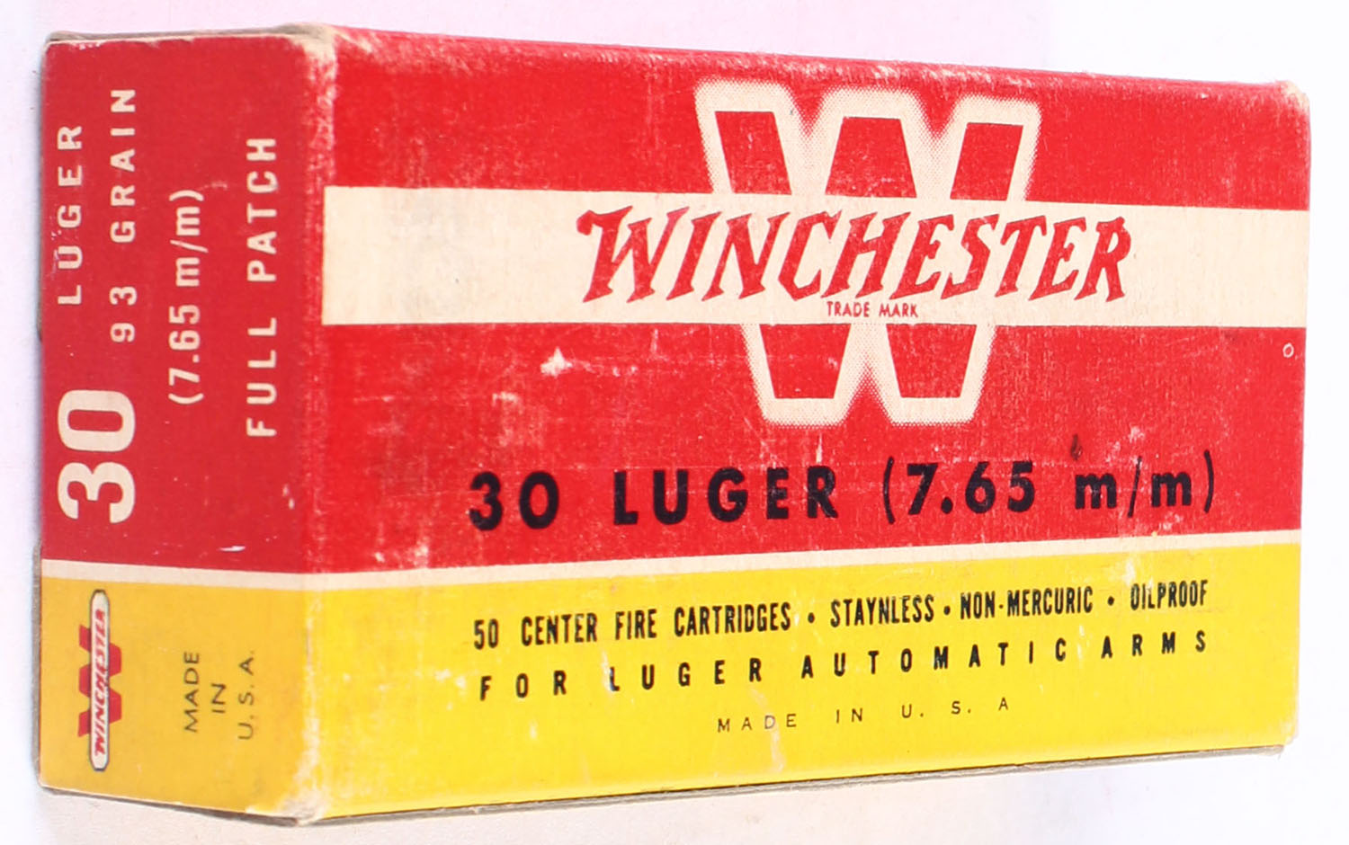 Winchester, Center Fire Cartridges, 30 Luger (7.65 m/m), 93 Grain Full Patch, 1pc. Red yellow & white box, box is very solid with minor scuffing, corners are sharp edges are crisp, ammo is excellent. Grade: Excellent - Value: 20 to 40