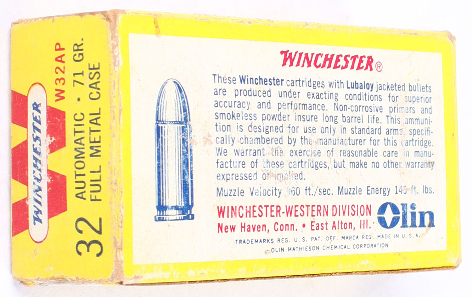 Winchester, Center Fire Cartridges, .32 Automatic, 71 Grain Full Metal Case, Partial 44rds, 1pc., Yellow white & red box, box has some shelf wear with light scuffing, end flaps are solid, ammo is excellent. Grade: Very Good - Value: 20 to 30