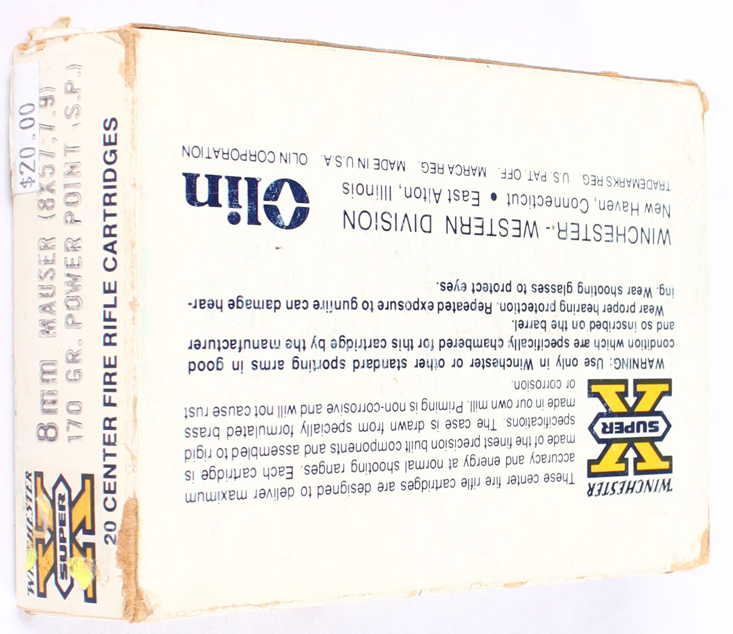 Winchester, Super-X, 8mm Mauser (8X57;7.9), 170 Gr. Power point Bullet, 1pc, Full with two ''FC'' rds., the rest are correct, white box with yellow/black print, box has rip marks, writing to top, handling wear, & edge wear, ammo is very good. Grade: Good ++ - Value: 20 to 30