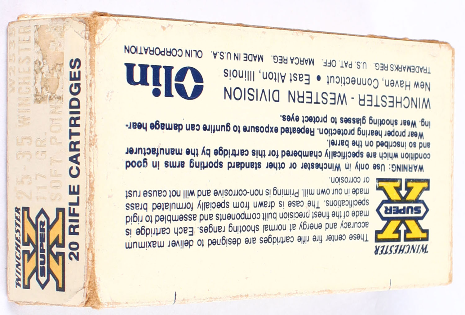 Winchester, Super X, 25-35 Winchester, 114 Grain, Full, 1pc. White & yellow box, box is solid with light age soiling & edge wear, end flaps are solid, ammo is excellent. Grade: Very Good - Value: 60 to 90